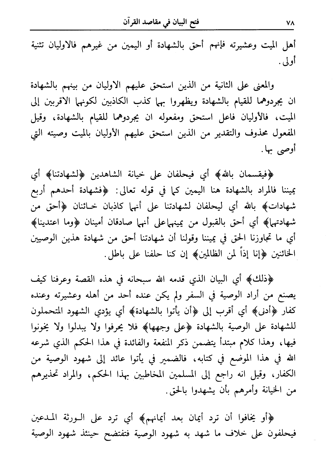 (فيقسمان بالله) أي فيحلفان على خيانة الشاهدين (لشهادتنا) أي يميننا فالمراد بالشهادة هنا اليمين كما في قوله تعالى: (فشهادة أحدهم أربع شهادات) بالله أي ليحلفان لشهادتنا على أنهما كاذبان خائنان (أحق من شهادتهما) أي أحق بالقبول من يمينهماعلى أنهما صادقان أمينان (وما اعتدينا) أي ما تجاوزنا الحق في يميننا وقولنا أن شهادتنا أحق من شهادة هذين الوصيين الخائنين (إنا إذاً لمن الظالمين) إن كنا حلفنا على باطل.