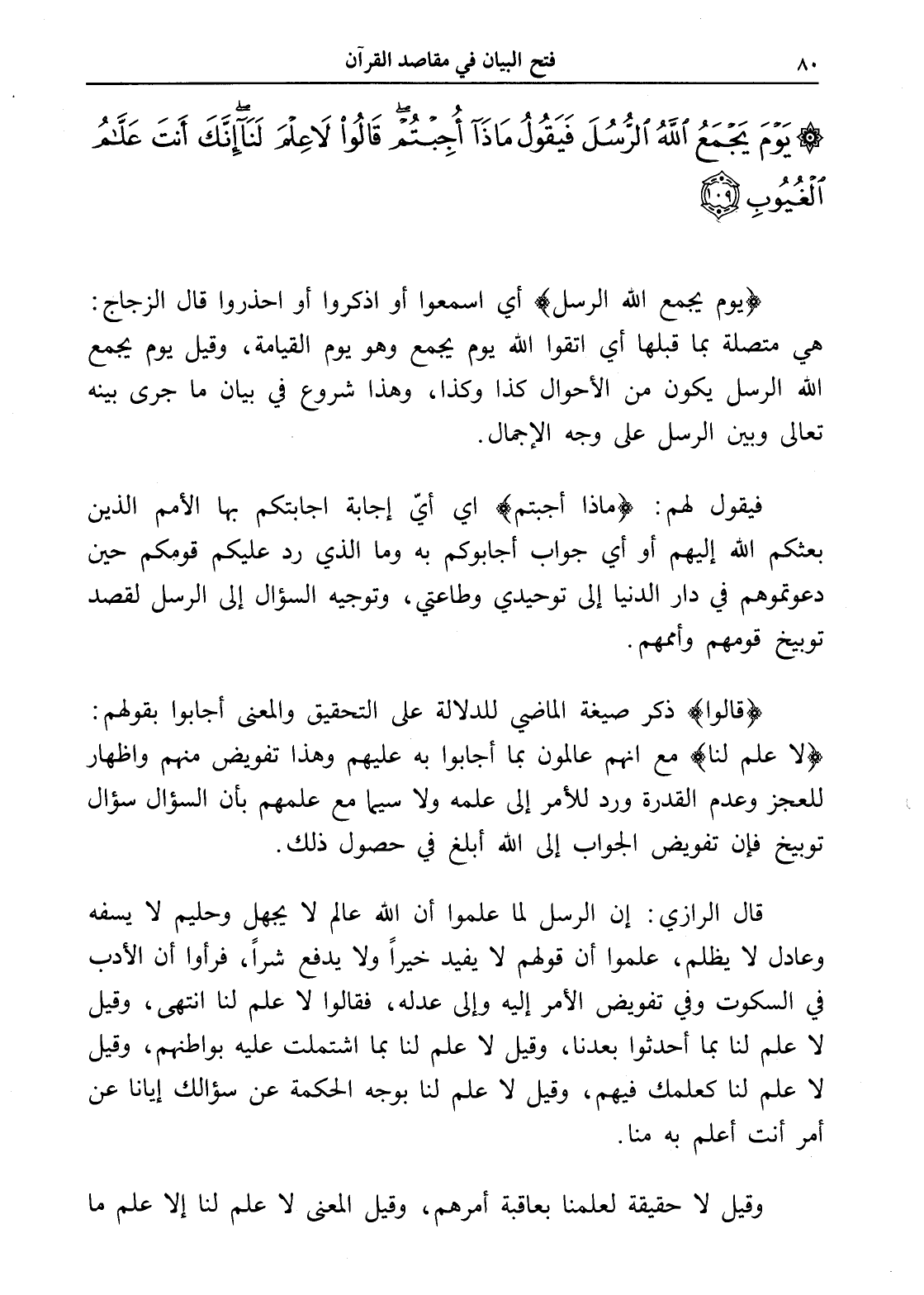 يَوْمَ يَجْمَعُ اللَّهُ الرُّسُلَ فَيَقُولُ مَاذَا أُجِبْتُمْ قَالُوا لَا عِلْمَ لَنَا إِنَّكَ أَنْتَ عَلَّامُ الْغُيُوبِ (109)
