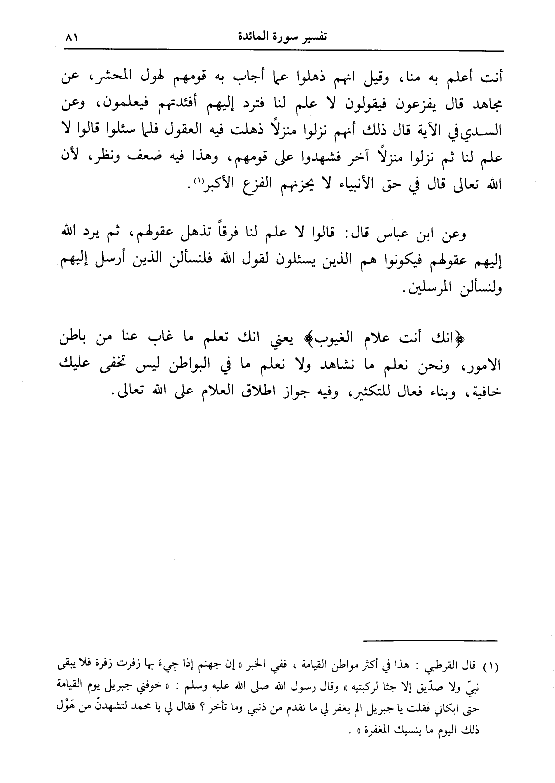 أنت أعلم به منا، وقيل إنهم ذهلوا عما أجاب به قومهم لهول المحشر، عن مجاهد قال يفزعون فيقولون لا علم لنا فترد إليهم أفئدتهم فيعلمون، وعن السدي في الآية قال ذلك أنهم نزلوا منزلاً ذهلت فيه العقول فلما سئلوا قالوا لا علم لنا ثم نزلوا منزلاً آخر فشهدوا على قومهم، وهذا فيه ضعف ونظر، لأن الله تعالى قال في حق الأنبياء لا يحزنهم الفزع الأكبر (¬1).