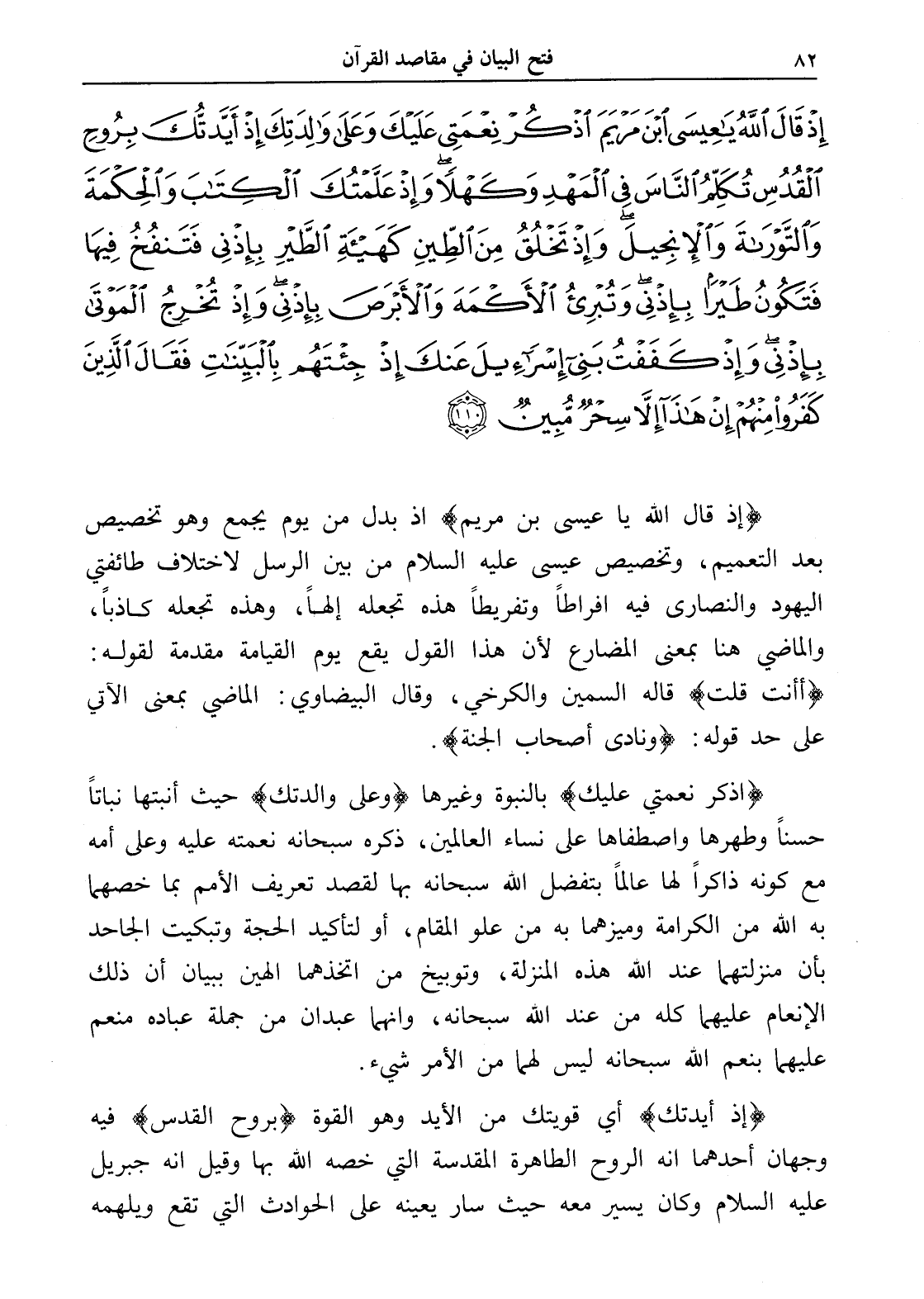 إِذْ قَالَ اللَّهُ يَا عِيسَى ابْنَ مَرْيَمَ اذْكُرْ نِعْمَتِي عَلَيْكَ وَعَلَى وَالِدَتِكَ إِذْ أَيَّدْتُكَ بِرُوحِ الْقُدُسِ تُكَلِّمُ النَّاسَ فِي الْمَهْدِ وَكَهْلاً وَإِذْ عَلَّمْتُكَ الْكِتَابَ وَالْحِكْمَةَ وَالتَّوْرَاةَ وَالْإِنْجِيلَ وَإِذْ تَخْلُقُ مِنَ الطِّينِ كَهَيْئَةِ الطَّيْرِ بِإِذْنِي فَتَنْفُخُ فِيهَا فَتَكُونُ طَيْرًا بِإِذْنِي وَتُبْرِئُ الْأَكْمَهَ وَالْأَبْرَصَ بِإِذْنِي وَإِذْ تُخْرِجُ الْمَوْتَى بِإِذْنِي وَإِذْ كَفَفْتُ بَنِي إِسْرَائِيلَ عَنْكَ إِذْ جِئْتَهُمْ بِالْبَيِّنَاتِ فَقَالَ الَّذِينَ كَفَرُوا مِنْهُمْ إِنْ هَذَا إِلَّا سِحْرٌ مُبِينٌ (110)