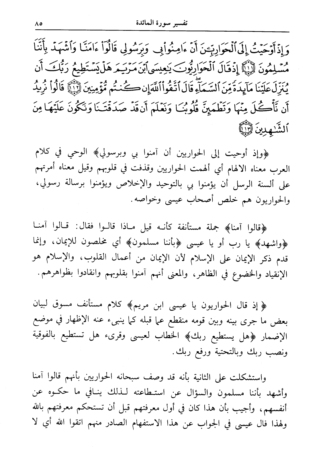 وَإِذْ أَوْحَيْتُ إِلَى الْحَوَارِيِّينَ أَنْ آمِنُوا بِي وَبِرَسُولِي قَالُوا آمَنَّا وَاشْهَدْ بِأَنَّنَا مُسْلِمُونَ (111) إِذْ قَالَ الْحَوَارِيُّونَ يَا عِيسَى ابْنَ مَرْيَمَ هَلْ يَسْتَطِيعُ رَبُّكَ أَنْ يُنَزِّلَ عَلَيْنَا مَائِدَةً مِنَ السَّمَاءِ قَالَ اتَّقُوا اللَّهَ إِنْ كُنْتُمْ مُؤْمِنِينَ (112) قَالُوا نُرِيدُ أَنْ نَأْكُلَ مِنْهَا وَتَطْمَئِنَّ قُلُوبُنَا وَنَعْلَمَ أَنْ قَدْ صَدَقْتَنَا وَنَكُونَ عَلَيْهَا مِنَ الشَّاهِدِينَ (113)