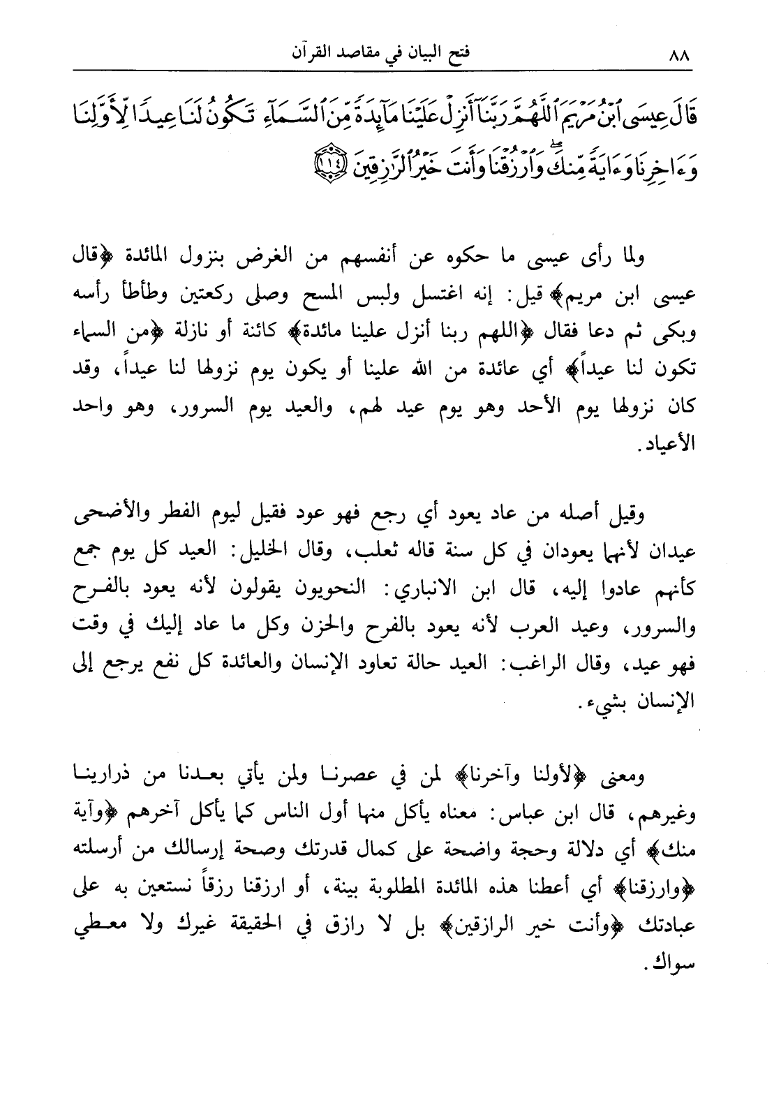 ولما رأى عيسى ما حكوه عن أنفسهم من الغرض بنزول المائدة (قال عيسى ابن مريم) قيل: إنه اغتسل ولبس المسح وصلى ركعتين وطأطأ رأسه وبكى ثم دعا فقال (اللهم ربنا أنزل علينا مائدة) كائنة أو نازلة (من السماء تكون لنا عيداً) أي عائدة من الله علينا أو يكون يوم نزولها لنا عيداً، وقد كان نزولها يوم الأحد وهو يوم عيد لهم، والعيد يوم السرور، وهو واحد الأعياد.