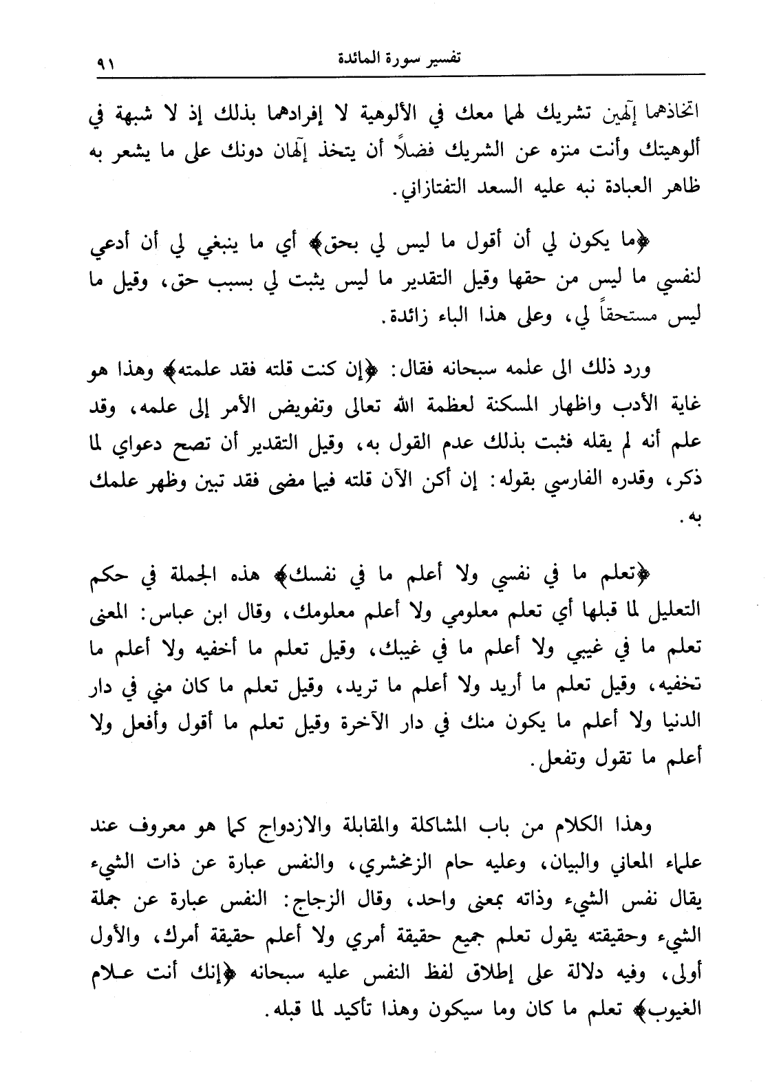 وهذا الكلام من باب المشاكلة والمقابلة والإزدواج كما هو معروف عند علماء المعاني والبيان، وعليه حام الزمخشري، والنفس عبارة عن ذات الشيء يقال نفس الشيء وذاته بمعنى واحد، وقال الزجاج: النفس عبارة عن جملة الشيء وحقيقته يقول تعلم جميع حقيقة أمري ولا أعلم حقيقة أمرك، والأول أولى، وفيه دلالة على إطلاق لفظ النفس عليه سبحانه (إنك أنت علام الغيوب) تعلم ما كان وما سيكون وهذا تأكيد لما قبله.