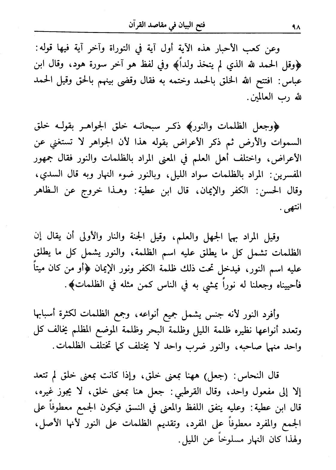 قال النحاس: (جعل) ههنا بمعنى خلق، وإذا كانت بمعنى خلق لم تتعد إلا إلى مفعول واحد، وقال القرطبي: جعل هنا بمعنى خلق، لا يجوز غيره، قال ابن عطية: وعليه يتفق اللفظ والمعنى في النسق فيكون الجمع معطوفاً على الجمع والمفرد معطوفاً على المفرد، وتقديم الظلمات على النور لأنها الأصل، ولهذا كان النهار مسلوخاً عن الليل.
