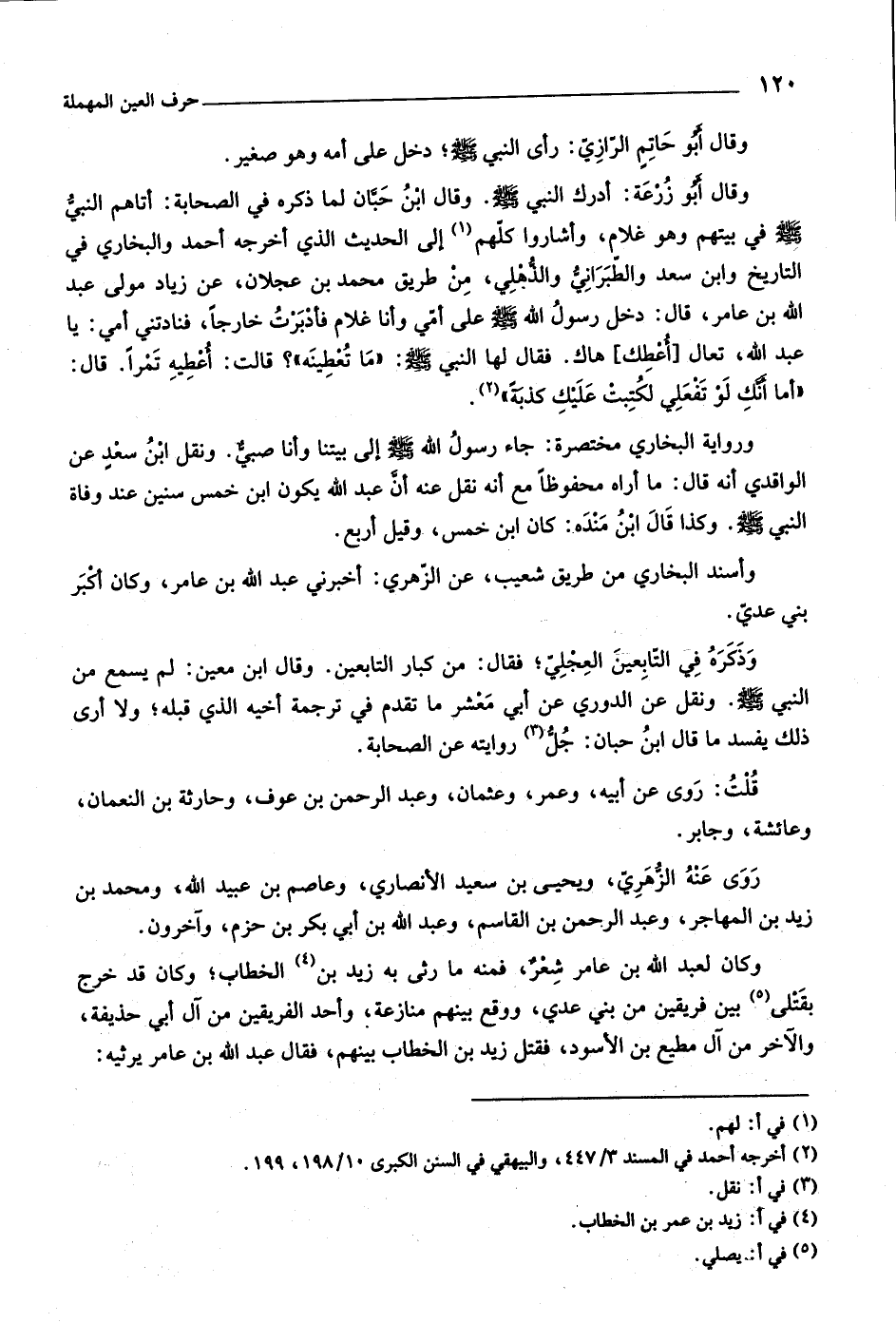 أخرجه أحمد والبخاري في التاريخ وابن سعد والطّبرانيّ والذّهليّ، من طريق محمد بن عجلان، عن زياد مولى عبد اللَّه بن عامر، قال: دخل رسول اللَّه صلى اللَّه عليه وآله وسلّم على أمّي وأنا غلام فأدبرت خارجا، فنادتني أمي: يا عبد اللَّه، تعال [أعطك] هاك. فقال لها النبيّ صلى اللَّه عليه وسلّم: «ما تعطينه» ؟ قالت: أعطيه تمرا. قال: