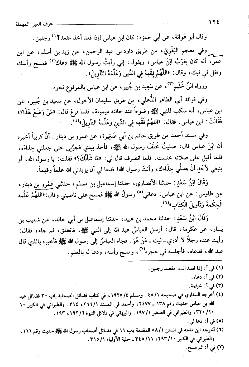 رأيت عنده رجلا لا أدري- ليت- من هو. فجاء العباس إلى رسول اللَّه صلى اللَّه عليه وآله وسلّم فأخبره بالذي قال عبد اللَّه، فدعاه، فأجلسه في حجره «٧» ، ومسح رأسه، ودعا له بالعلم.