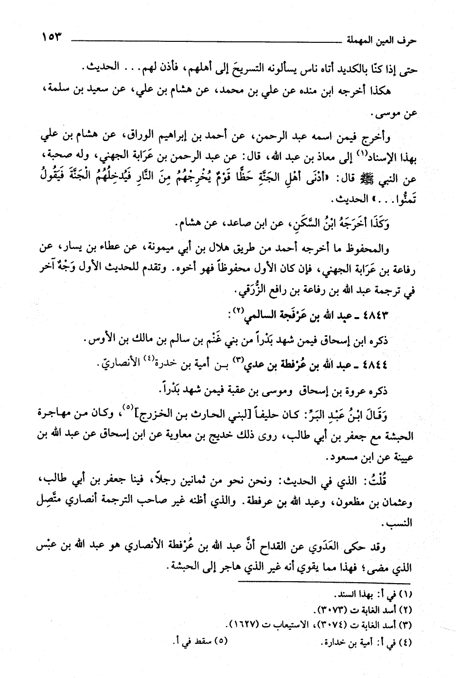 وأخرج فيمن اسمه عبد الرحمن، عن أحمد بن إبراهيم الوراق، عن هشام بن علي بهذا الإسناد «١» إلى معاذ بن عبد اللَّه، قال: عن عبد الرحمن بن عرابة الجهنيّ، وله صحبة، عن النبيّ صلى اللَّه عليه وسلّم قال: «أدنى أهل الجنّة حظّا قوم يخرجهم من النّار فيدخلهم الجنّة فيقول تمنّوا ... » الحديث.
