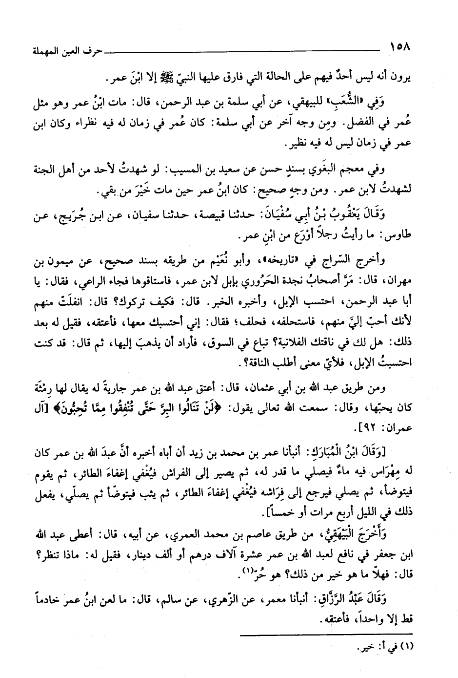 وأخرج السّراج في «تاريخه» ، وأبو نعيم من طريقه بسند صحيح، عن ميمون بن مهران، قال: مرّ أصحاب نجدة الحروري بإبل لابن عمر، فاستاقوها فجاء الراعي، فقال: يا أبا عبد الرحمن، احتسب الإبل، وأخبره الخبر. قال: فكيف تركوك؟ قال: انفلت منهم لأنك أحبّ إليّ منهم، فاستحلفه، فحلف، فقال: إني أحتسبك معها، فأعتقه، فقيل له بعد ذلك: هل لك في ناقتك الفلانية؟ تباع في السوق، فأراد أن يذهب إليها، ثم قال: قد كنت احتسب الإبل، فلأيّ معنى أطلب الناقة؟.