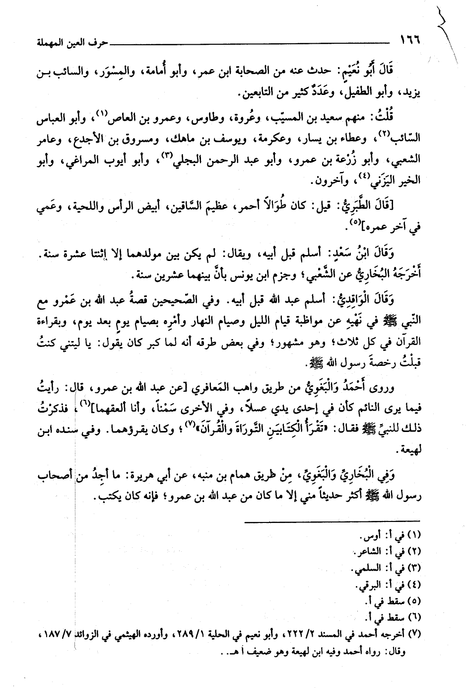 (٧) أخرجه أحمد في المسند ٢/ ٢٢٢، وأبو نعيم في الحلية ١/ ٢٨٩، وأورده الهيثمي في الزوائد ٧/ ١٨٧، وقال: رواه أحمد وفيه ابن لهيعة وهو ضعيف انتهى..