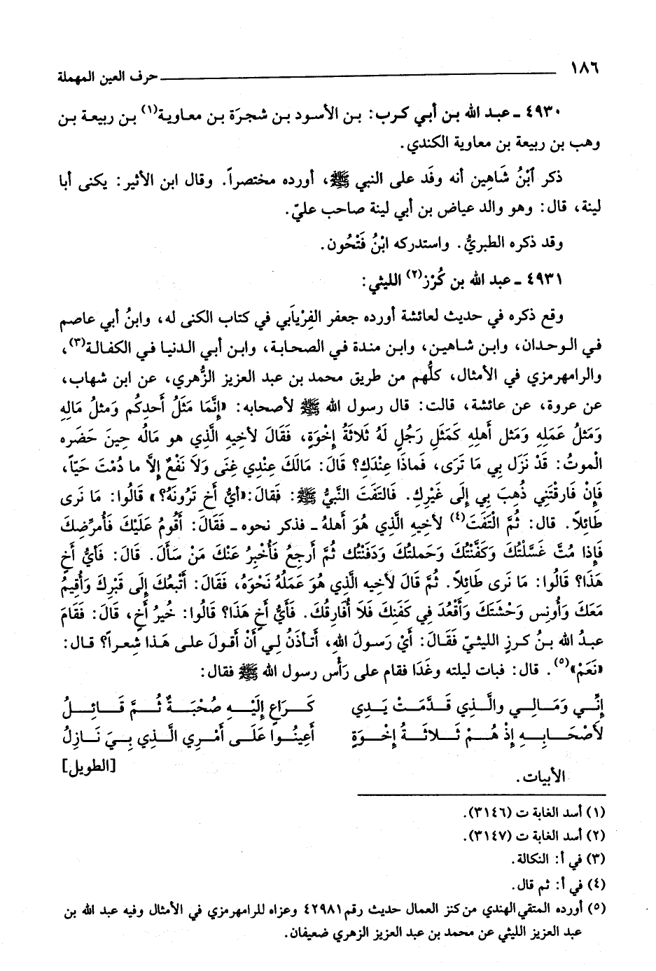 وقع ذكره في حديث لعائشة أورده جعفر الفريابي في كتاب الكنى له، وابن أبي عاصم في الوحدان، وابن شاهين، وابن مندة في الصحابة، وابن أبي الدنيا في الكفالة «٣» ، والرامهرمزيّ في الأمثال، كلّهم من طريق محمد بن عبد العزيز الزّهري، عن ابن شهاب، عن عروة، عن عائشة، قالت: قال رسول اللَّه صلى اللَّه عليه وسلّم لأصحابه: «إنّما مثل أحدكم ومثل ماله ومثل عمله ومثل أهله كمثل رجل له ثلاثة إخوة، فقال لأخيه الّذي هو ماله حين حضره الموت: قد نزل بي ما ترى، فماذا عندك؟ قال: مالك عندي غنى ولا نفع إلّا ما دمت حيّا، فإن فارقتني ذهب بي إلى غيرك. فالتفت النبيّ صلى اللَّه عليه وسلّم: فقال: «أيّ أخ ترونه؟» قالوا: ما نرى طائلا. قال: ثمّ التفت «٤» لأخيه الّذي هو أهله- فذكر نحوه- فقال: أقوم عليك فأمرّضك فإذا متّ غسّلتك وكفّنتك وحملتك ودفنتك ثمّ أرجع فأخبر عنك من سأل. قال: فأيّ أخ هذا؟ قالوا: ما نرى طائلا. ثمّ قال لأخيه الّذي هو عمله نحوه، فقال: أتبعك إلى قبرك وأقيم معك وأونس وحشتك وأقعد في كفنك فلا أفارقك. فأيّ أخ هذا؟ قالوا: خير أخ، قال: فقام عبد اللَّه بن كرز الليثيّ فقال: أي رسول اللَّه، أتأذن لي أن أقول على هذا شعرا؟ قال: