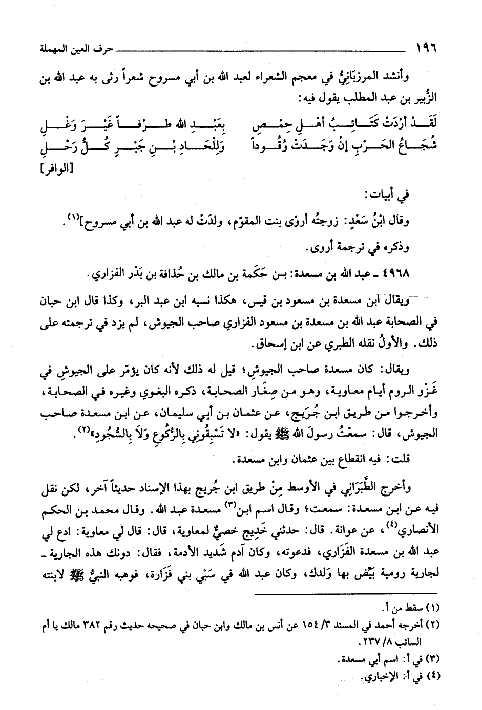 ويقال ابن مسعدة بن مسعود بن قيس، هكذا نسبه ابن عبد البر، وكذا قال ابن حبان في الصحابة عبد اللَّه بن مسعدة بن مسعود الفزاري صاحب الجيوش، لم يزد في ترجمته على ذلك. والأول نقله الطبري عن ابن إسحاق.