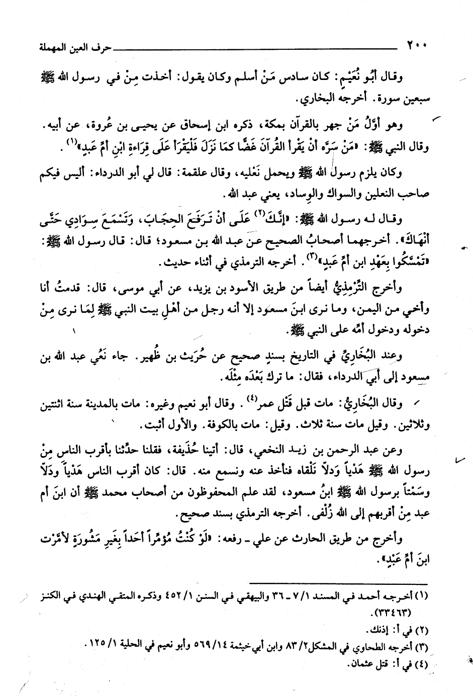 وعن عبد الرحمن بن زيد النخعي، قال: أتينا حذيفة، فقلنا حدّثنا بأقرب الناس من رسول اللَّه صلى اللَّه عليه وسلّم هديا ودلا نلقاه فنأخذ عنه ونسمع منه. قال: كان أقرب الناس هديا ودلّا وسمتا برسول اللَّه صلى اللَّه عليه وسلّم ابن مسعود، لقد علم المحفوظون من أصحاب محمد صلى اللَّه عليه وسلّم أن ابن أم عبد من أقربهم إلى اللَّه زلفى. أخرجه الترمذي بسند صحيح.