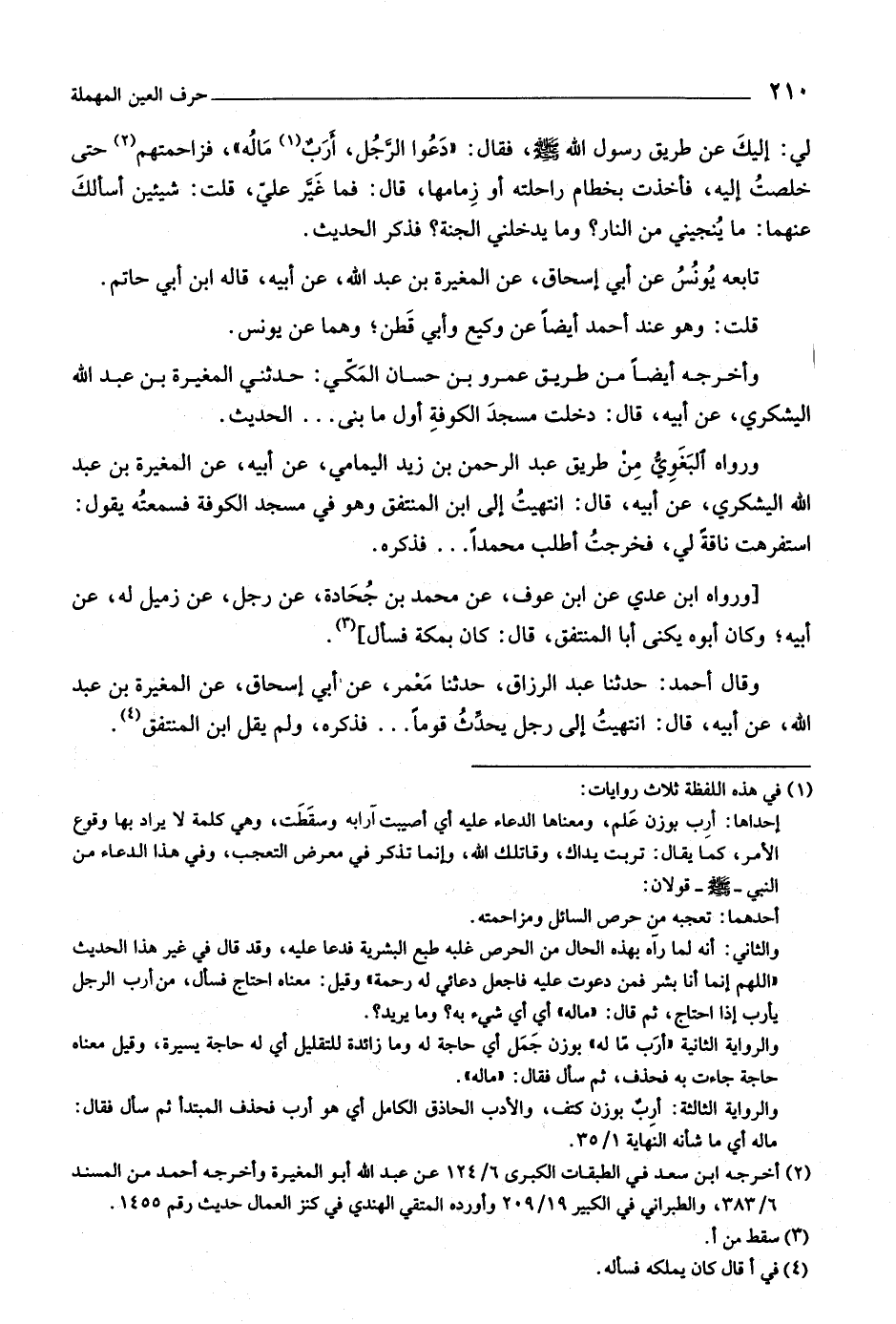 وقال أحمد: حدثنا عبد الرزاق، حدثنا معمر، عن أبي إسحاق، عن المغيرة بن عبد اللَّه، عن أبيه، قال: انتهيت إلى رجل يحدّث قوما ... فذكره، ولم يقل ابن المنتفق «٤» .