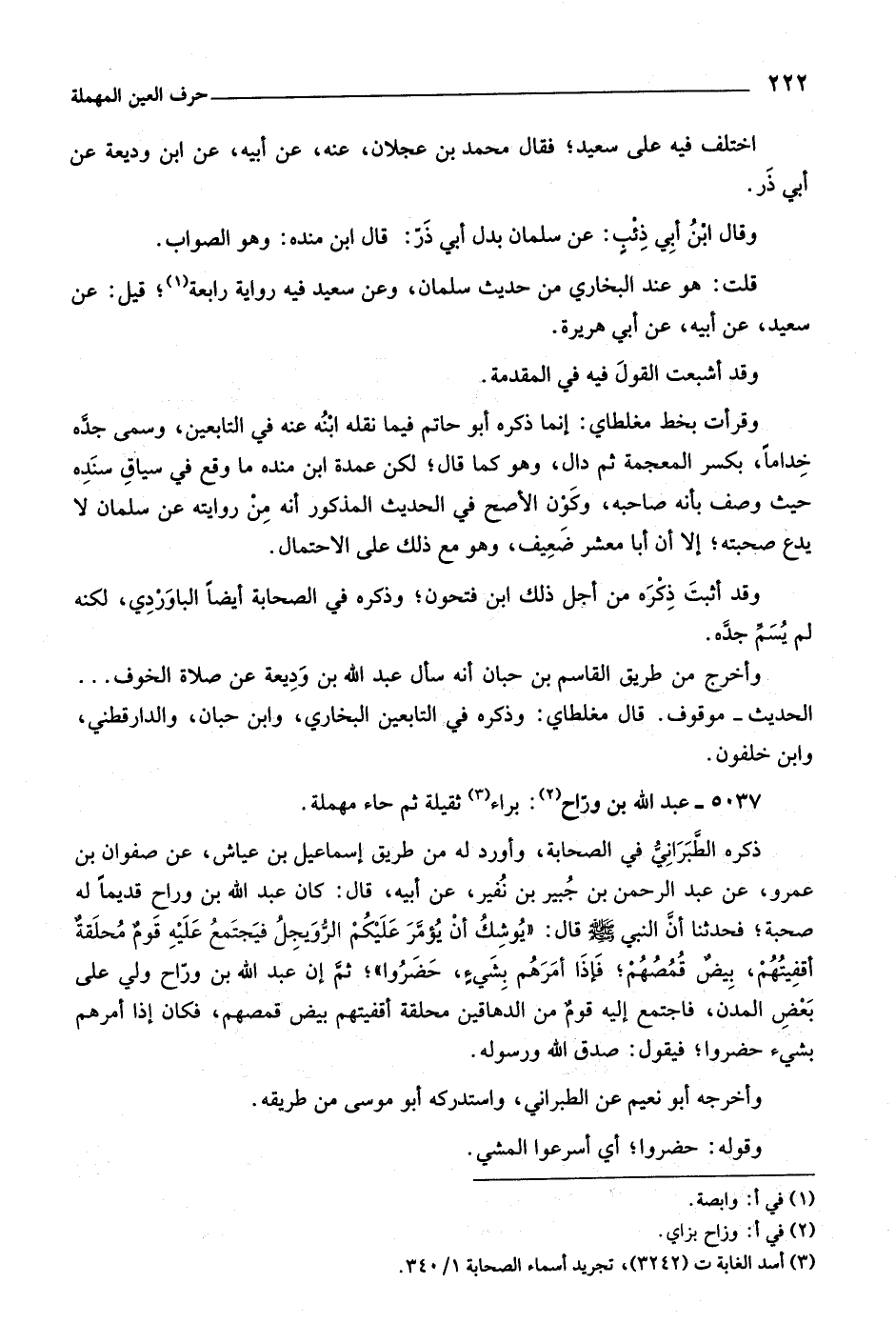 وقرأت بخط مغلطاي: إنما ذكره أبو حاتم فيما نقله ابنه عنه في التابعين، وسمى جدّه خداما، بكسر المعجمة ثم دال، وهو كما قال: لكن عمدة ابن مندة ما وقع في سياق سنده حيث وصف بأنه صاحبه، وكون الأصح في الحديث المذكور أنه من روايته عن سلمان لا يدع صحبته، إلا أن أبا معشر ضعيف، وهو مع ذلك على الاحتمال.