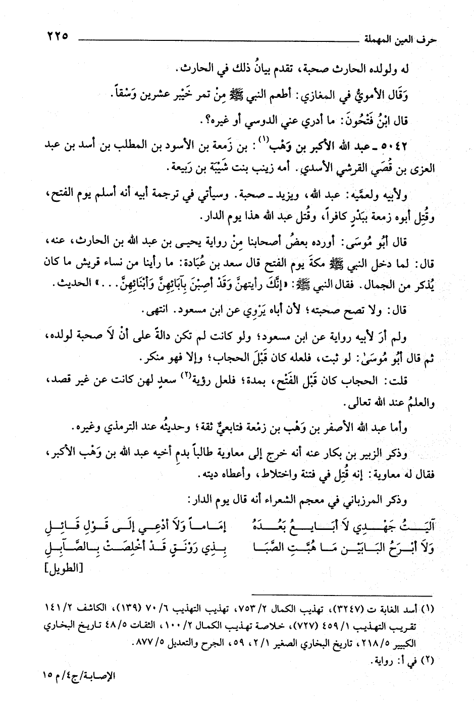 ولأبيه ولعمّيه: عبد اللَّه، ويزيد- صحبة. وسيأتي في ترجمة أبيه أنه أسلم يوم الفتح، وقتل أبوه زمعة ببدر كافرا، وقتل عبد اللَّه هذا يوم الدار.