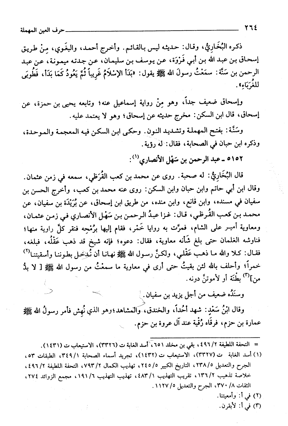 وقال ابن أبي حاتم وابن حبان وابن السكن: روى عنه محمد بن كعب، وأخرج الحسن بن سفيان في مسندة، وابن قانع، وابن مندة، من طريق ابن إسحاق، عن بريدة بن سفيان، عن محمد بن كعب القرظي، قال: غزا عبد الرحمن بن سهل الأنصاري في زمن عثمان، ومعاوية أمير على الشام، فمرّت به روايا خمر، فقام إليها برمحه فنقر كلّ راوية منها، فناوشه الغلمان حتى بلغ شأنه معاوية، فقال: دعوه، فإنه شيخ قد ذهب عقله، فبلغه، فقال: كلا واللَّه ما ذهب عقلي، ولكنّ رسول اللَّه صلى اللَّه عليه وسلّم نهانا أن ندخل بطوننا وأسقيتنا «٢» خمرا، وأحلف باللَّه لئن بقيت حتى أرى في معاوية ما سمعت من رسول اللَّه صلى اللَّه عليه وسلّم [لا بدّ من] «٣» بطنة أو لأموتنّ دونه.