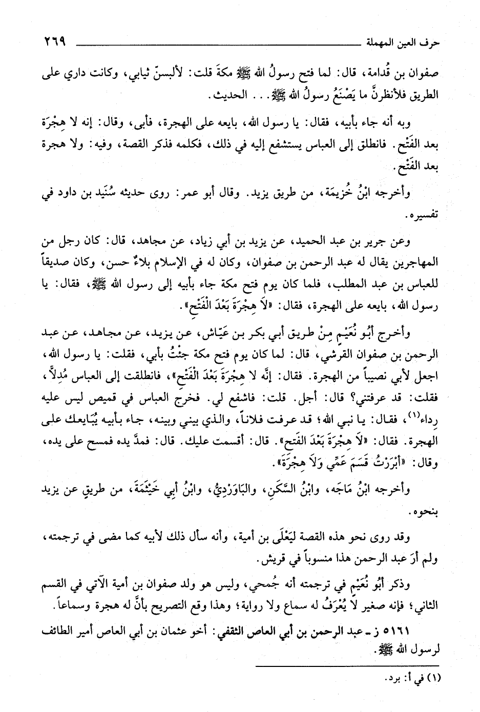 وعن جرير بن عبد الحميد، عن يزيد بن أبي زياد، عن مجاهد، قال: كان رجل من المهاجرين يقال له عبد الرحمن بن صفوان، وكان له في الإسلام بلاء حسن، وكان صديقا للعباس بن عبد المطلب، فلما كان يوم فتح مكة جاء بأبيه إلى رسول اللَّه صلى اللَّه عليه وسلّم، فقال: يا رسول اللَّه، بايعه على الهجرة، فقال: «لا هجرة بعد الفتح» .