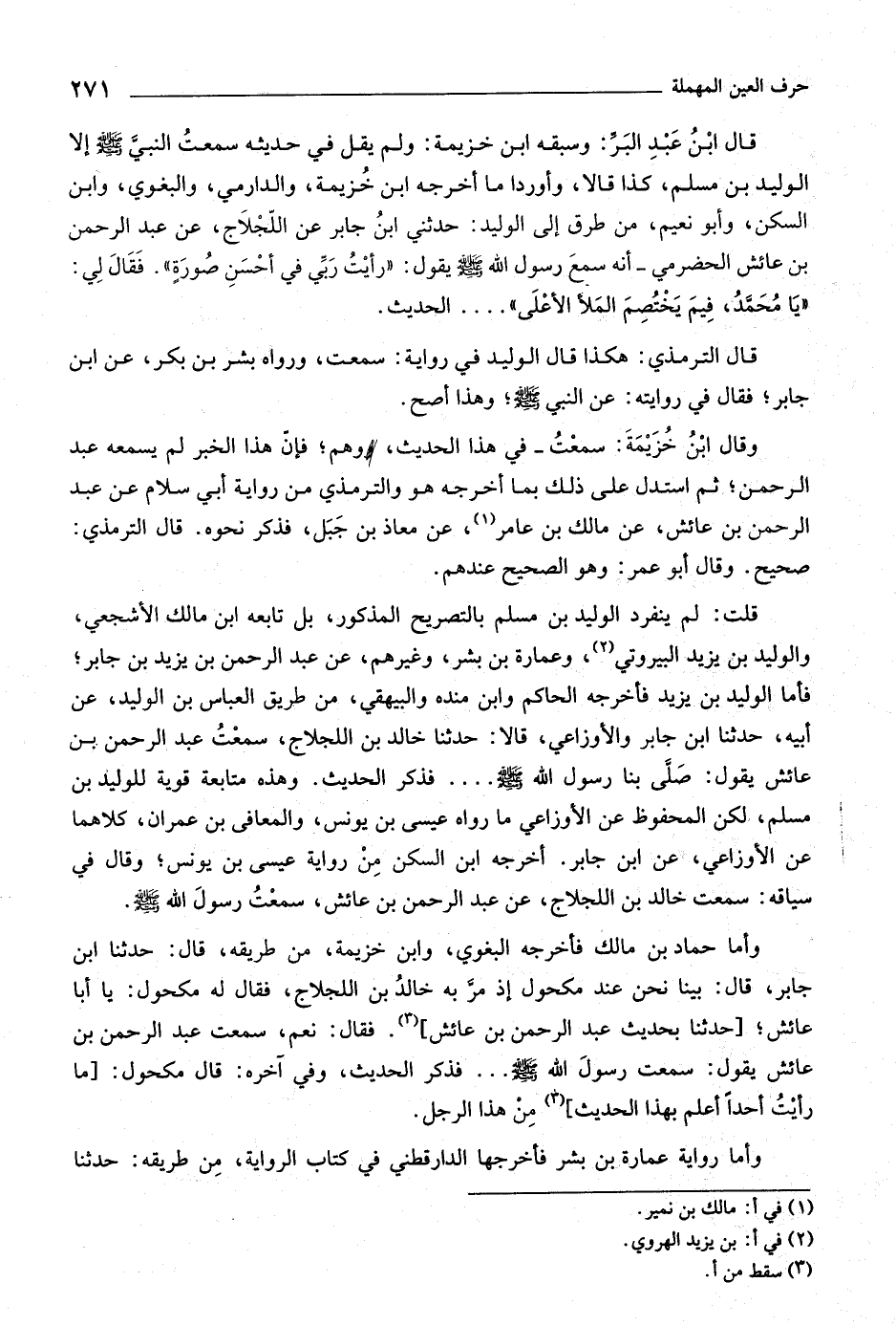وأما حماد بن مالك فأخرجه البغوي، وابن خزيمة، من طريقه، قال: حدثنا ابن جابر، قال: بينا نحن عند مكحول إذ مرّ به خالد بن اللجلاج، فقال له مكحول: يا أبا عائش، [حدثنا بحديث عبد الرحمن بن عائش] «٣» . فقال: نعم، سمعت عبد الرحمن بن عائش يقول: سمعت رسول اللَّه صلى اللَّه عليه وسلّم ... فذكر الحديث، وفي آخره: قال مكحول: [ما رأيت أحدا أعلم بهذا الحديث] «٤» من هذا الرجل.