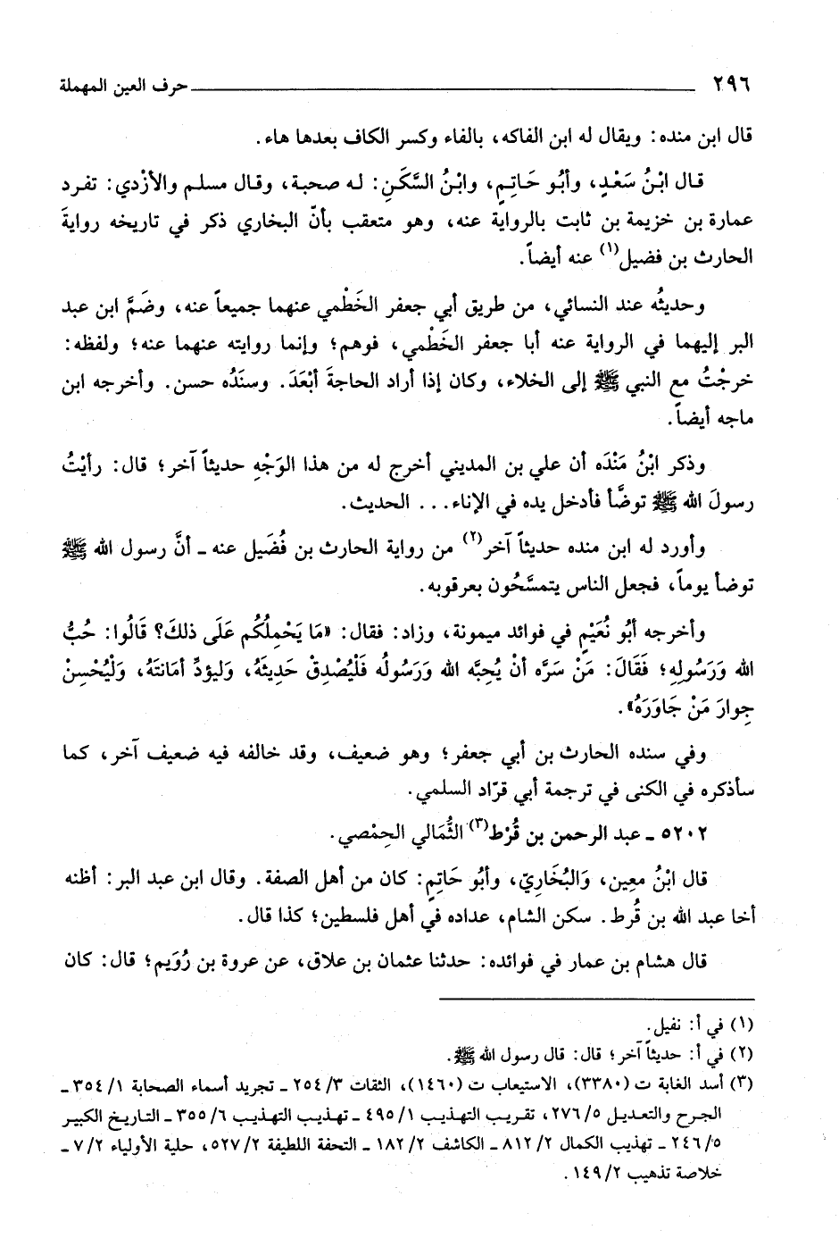 وأورد له ابن مندة حديثا آخر «٢» من رواية الحارث بن فضيل عنه- أنّ رسول اللَّه صلى اللَّه عليه وآله وسلّم توضأ يوما، فجعل الناس يتمسّحون بعرقوبه.