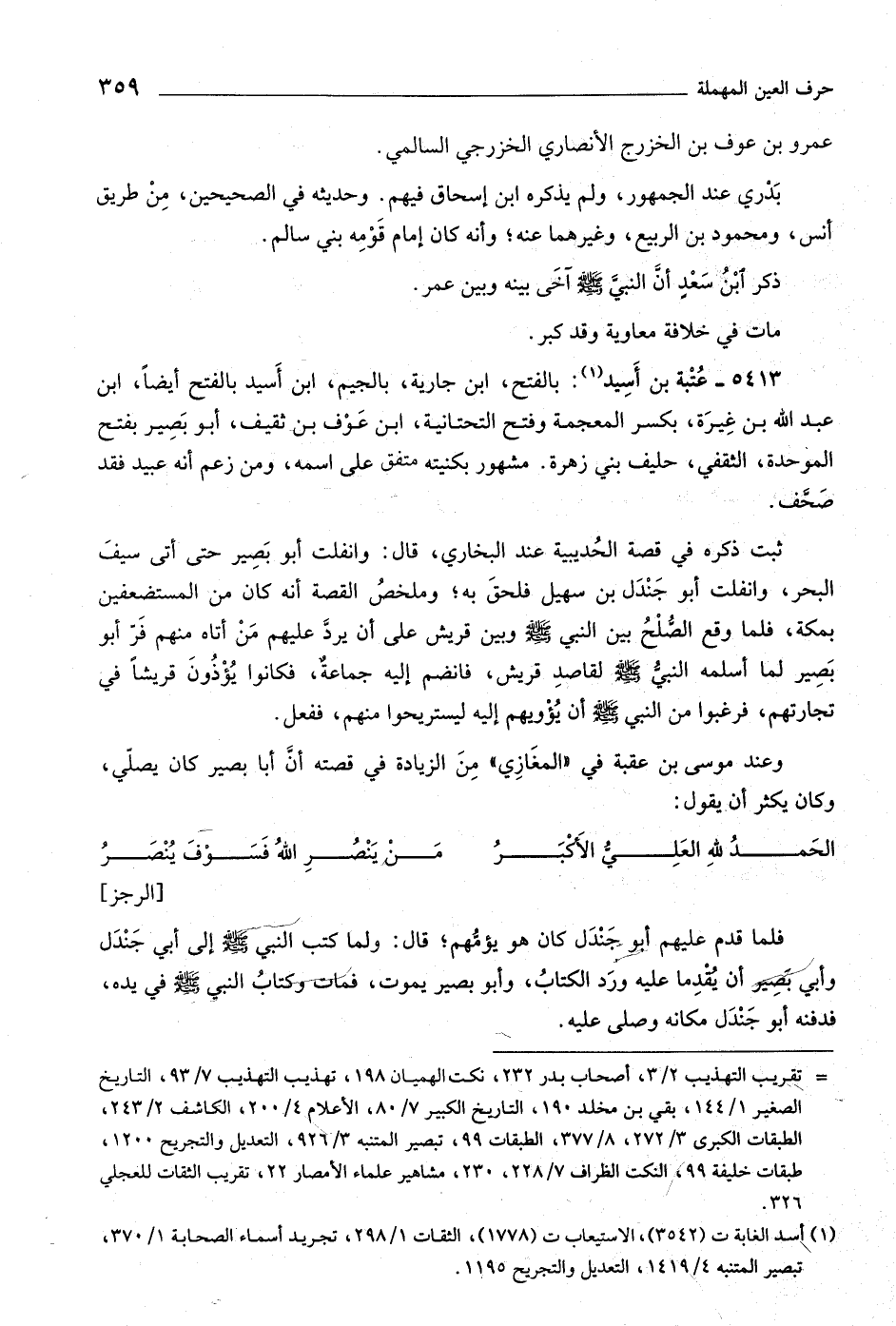 بالفتح، ابن جارية، بالجيم، ابن أسيد بالفتح أيضا، ابن عبد اللَّه بن غيرة، بكسر المعجمة وفتح التحتانية، ابن عوف بن ثقيف، أبو بصير بفتح الموحدة، الثقفي، حليف بني زهرة. مشهور بكنيته متفق على اسمه، ومن زعم أنه عبيد فقد صحّف.