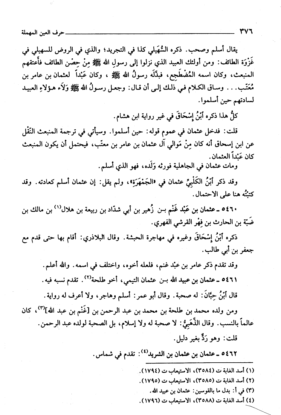 وقد ذكر ابن الكلبيّ عثمان في «الجمهرة» ، ولم يقل: إن عثمان أسلم كعادته. وقد كتبته هنا على الاحتمال.