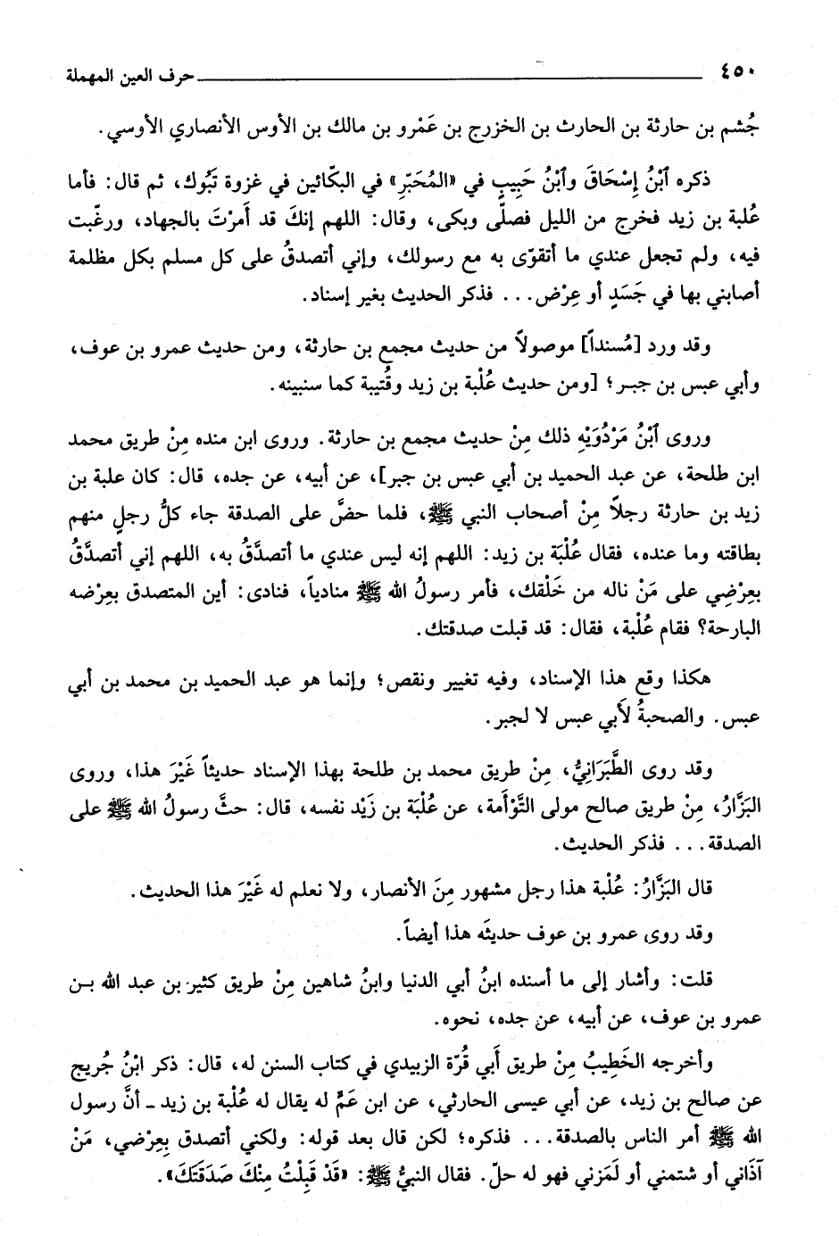 وروى ابن مردويه ذلك من حديث مجمع بن حارثة. وروى ابن مندة من طريق محمد ابن طلحة، عن عبد الحميد بن أبي عبس بن جبر] ، عن أبيه، عن جده، قال: كان علبة بن زيد بن حارثة رجلا من أصحاب النبيّ صلى اللَّه عليه وسلّم، فلما حضّ على الصدقة جاء كلّ رجل منهم بطاقته وما عنده، فقال علبة بن زيد: اللَّهمّ إنه ليس عندي ما أتصدّق به، اللَّهمّ إني أتصدّق بعرضي على من ناله من خلقك، فأمر رسول اللَّه صلى اللَّه عليه وسلّم مناديا، فنادى: أين المتصدق بعرضه البارحة؟