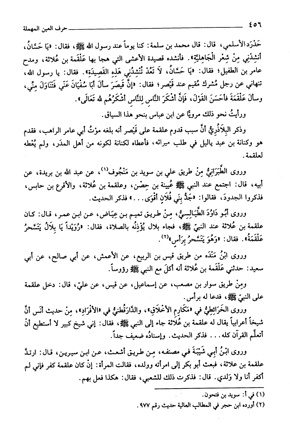 وروى ابن مندة من طريق قيس بن الربيع، عن الأعمش، عن أبي صالح، عن أبي سعيد: حدثني علقمة بن علاثة أنه أكل مع النبيّ صلى اللَّه عليه وسلّم رءوسا.