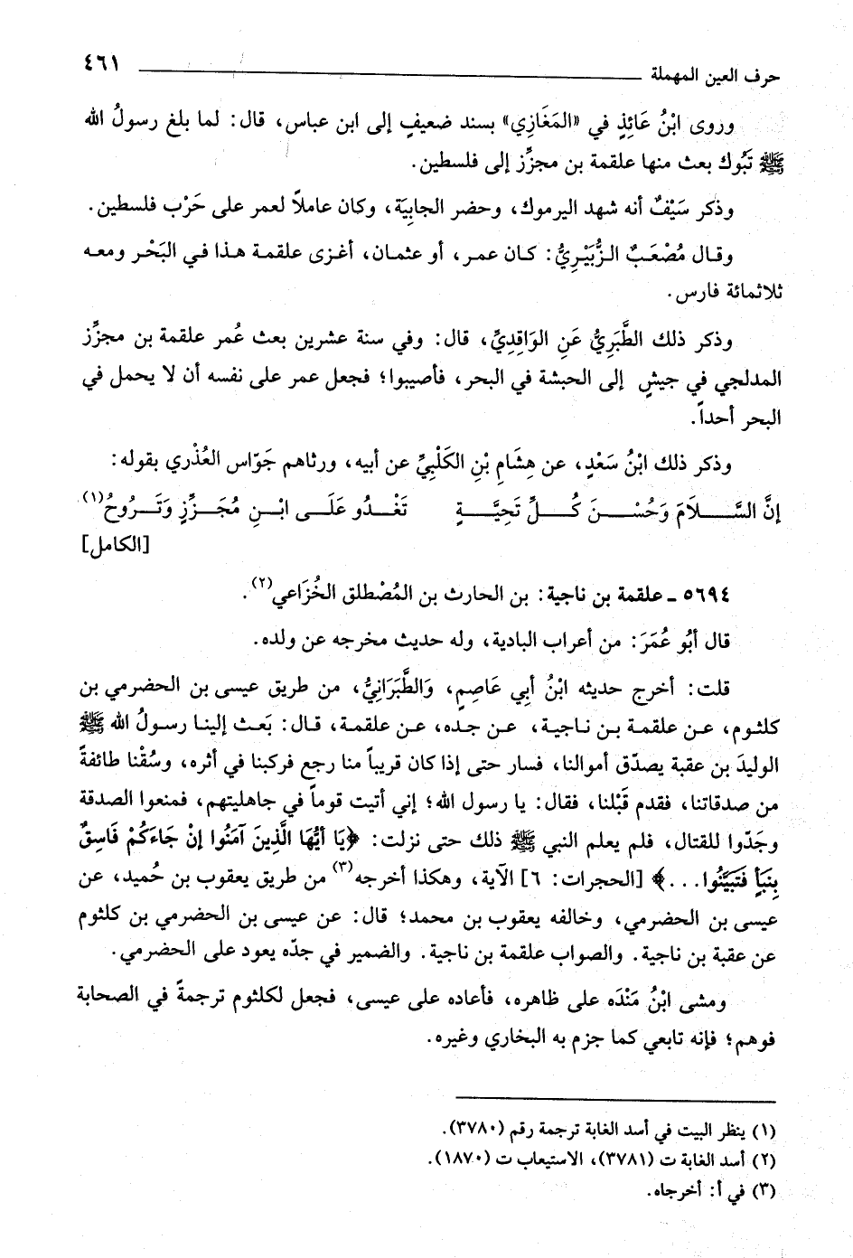 قلت: أخرج حديثه ابن أبي عاصم، والطّبرانيّ، من طريق عيسى بن الحضرميّ بن كلثوم، عن علقمة بن ناجية عن جده، عن علقمة، قال: بعث إلينا رسول اللَّه صلى اللَّه عليه وسلّم الوليد بن عقبة يصدّق أموالنا، فسار حتى إذا كان قريبا منا رجع فركبنا في أثره، وسقنا طائفة من صدقاتنا، فقدم قبلنا، فقال: يا رسول اللَّه، إني أتيت قوما في جاهليتهم، فمنعوا الصدقة وجدّوا للقتال، فلم يعلم النبيّ صلى اللَّه عليه وسلّم ذلك حتى نزلت: يا أَيُّهَا الَّذِينَ آمَنُوا إِنْ جاءَكُمْ فاسِقٌ بِنَبَإٍ فَتَبَيَّنُوا ... [الحجرات: ٦] الآية، وهكذا أخرجه «٣» من طريق يعقوب بن حميد، عن عيسى بن الحضرميّ، وخالفه يعقوب بن محمد، قال: عن عيسى بن الحضرميّ بن كلثوم عن عقبة بن ناجية. والصواب علقمة بن ناجية. والضمير في جدّه يعود على الحضرميّ.