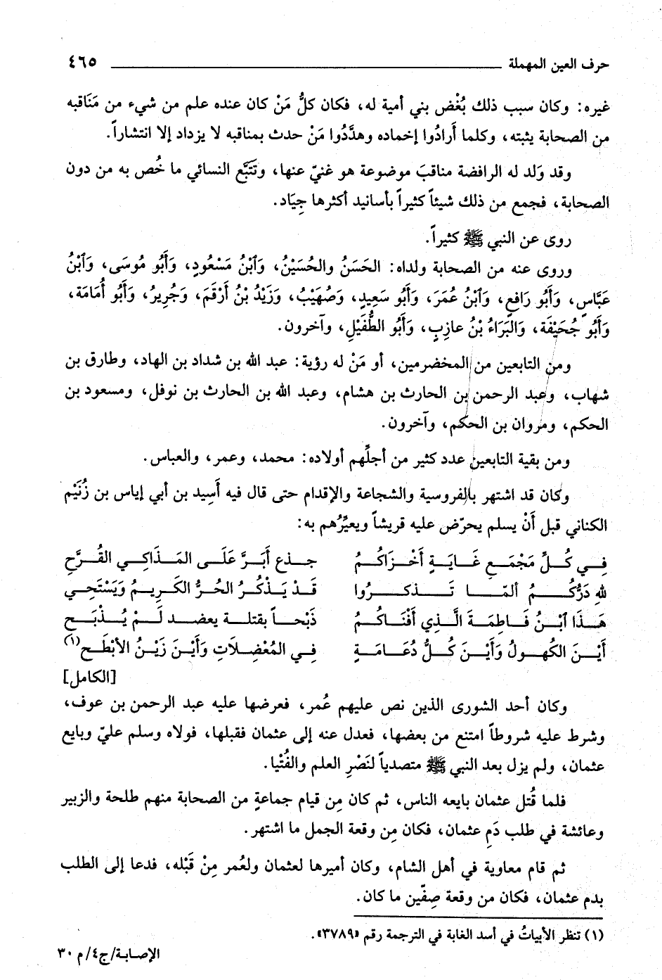 [الكامل] وكان أحد الشورى الذين نص عليهم عمر، فعرضها عليه عبد الرحمن بن عوف، وشرط عليه شروطا امتنع من بعضها، فعدل عنه إلى عثمان فقبلها، فولاه وسلم عليّ وبايع عثمان، ولم يزل بعد النبيّ صلى اللَّه عليه وسلّم متصديا لنصر العلم والفتيا.