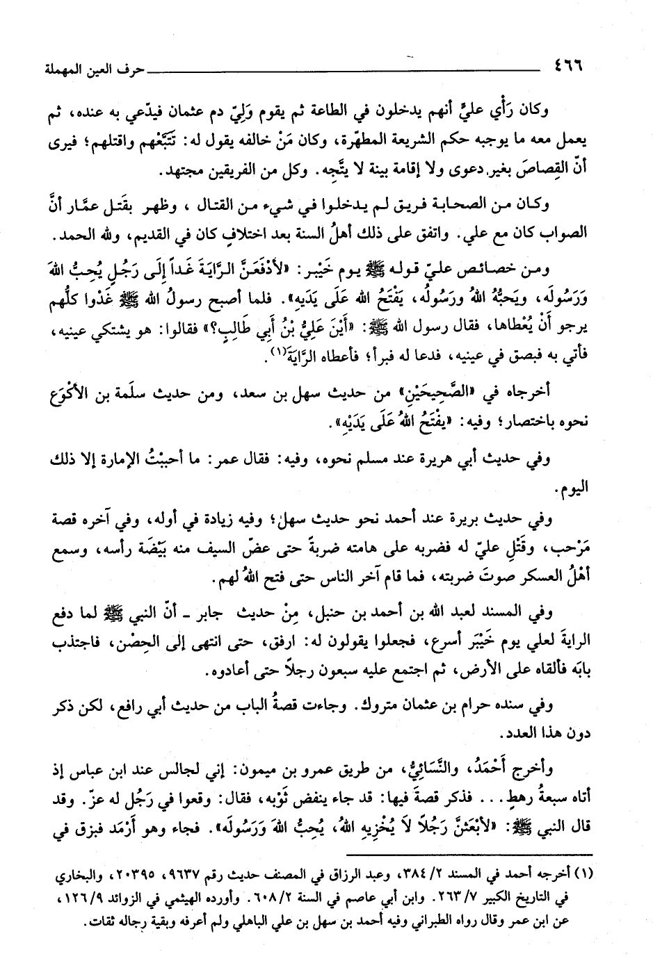 وأخرج أحمد، والنّسائيّ، من طريق عمرو بن ميمون: إني لجالس عند ابن عباس إذ أتاه سبعة رهط ... فذكر قصة فيها: قد جاء ينفض ثوبه، فقال: وقعوا في رجل له عزّ. وقد قال النبيّ صلى اللَّه عليه وسلّم: «لأبعثنّ رجلا لا يخزيه اللَّه، يحبّ اللَّه ورسوله» . فجاء وهو أرمد فبزق في