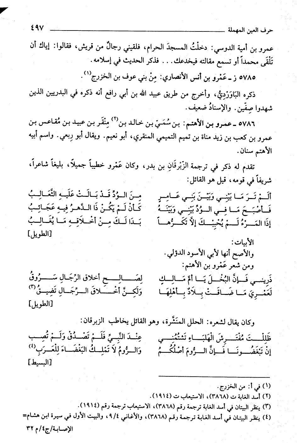(٣) ينظر البيتان في أسد الغابة ترجمة رقم (٣٨٦٨) ، الاستيعاب ترجمة رقم (١٩١٤) .
