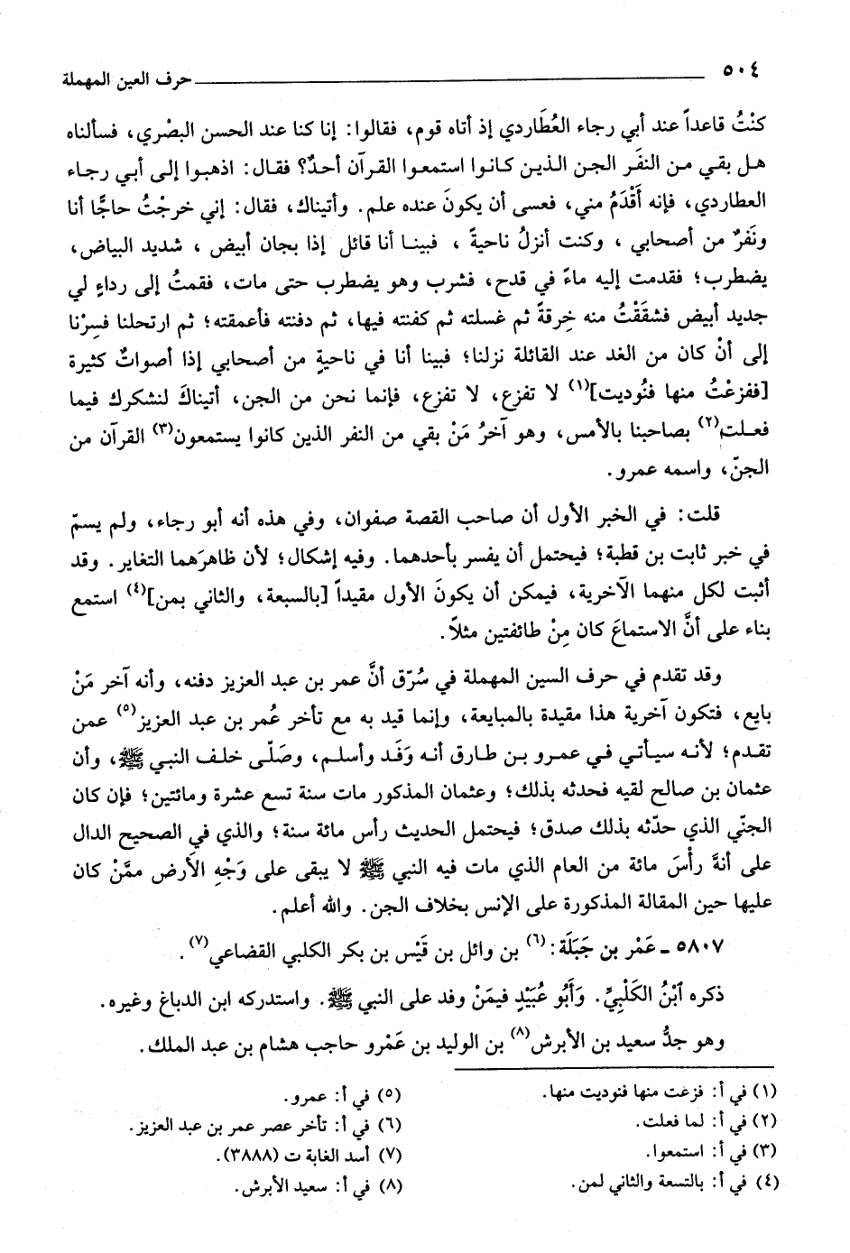 كنت قاعدا عند أبي رجاء العطاردي إذ أتاه قوم، فقالوا: إنا كنا عند الحسن البصري، فسألناه هل بقي من النفر الجن الذين كانوا استمعوا القرآن أحد؟ فقال: اذهبوا إلى أبي رجاء العطاردي، فإنه أقدم مني، فعسى أن يكون عنده علم. وأتيناك، فقال: إني خرجت حاجّا أنا ونفر من أصحابي، وكنت أنزل ناحية، فبينا أنا قائل إذا بجان أبيض، شديد البياض، يضطرب، فقدمت إليه ماء في قدح، فشرب وهو يضطرب حتى مات، فقمت إلى رداء لي جديد أبيض فشققت منه خرقة ثم غسلته ثم كفنته فيها، ثم دفنته فأعمقته، ثم ارتحلنا فسرنا إلى أن كان من الغد عند القائلة نزلنا، فبينا أنا في ناحية من أصحابي إذا أصوات كثيرة [ففزعت منها فنوديت] «١» لا تفزع، لا تفزع، فإنما نحن من الجن، أتيناك لنشرك فيما فعلت «٢» بصاحبنا بالأمس، وهو آخر من بقي من النفر الذين كانوا يستمعون «٣» القرآن من الجنّ، واسمه عمرو.