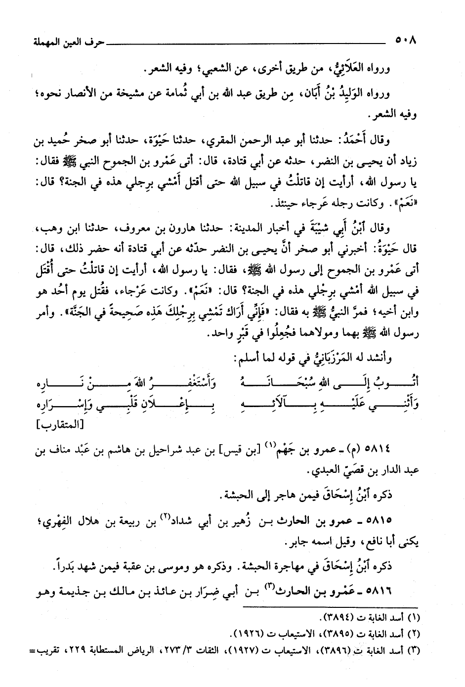 وقال ابن أبي شيبة في أخبار المدينة: حدثنا هارون بن معروف، حدثنا ابن وهب، قال حيوة: أخبرني أبو صخر أنّ يحيى بن النضر حدّثه عن أبي قتادة أنه حضر ذلك، قال: أتى عمرو بن الجموح إلى رسول اللَّه صلى اللَّه عليه وسلّم، فقال: يا رسول اللَّه، أرأيت إن قاتلت حتى أقتل في سبيل اللَّه أمشي برجلي هذه في الجنة؟ قال: «نعم» . وكانت عرجاء، فقتل يوم أحد هو وابن أخيه، فمرّ النبيّ صلى اللَّه عليه وسلّم به فقال: «فإنّي أراك تمشي برجلك هذه صحيحة في الجنّة» . وأمر رسول اللَّه صلى اللَّه عليه وسلّم بهما ومولاهما فجعلوا في قبر واحد.