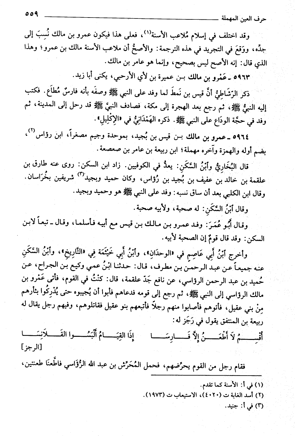 وأخرج ابن أبي عاصم في «الوحدان» ، وابن أبي خيثمة في «التّاريخ» ، وابن السّكن عنه جميعا عن عبد الرحمن بن مطرف، قال: حدثنا ابن عمي وكيع بن الجراح، عن حميد بن عبد الرحمن الرؤاسي، عن نافع جدّ علقمة، قال: كنت في القوم، فأتى عمرو بن مالك الرؤاسي إلى النبيّ صلى اللَّه عليه وسلّم، ثم رجع إلى قومه فدعاهم فأبوا أن يجيبوه حتى يدركوا بثأرهم من بني عقيل، فأتوهم فأصابوا منهم رجلا فأتبعهم بنو عقيل فقاتلوهم، وفيهم رجل يقال له ربيعة بن المنتفق يقول في رجز له: