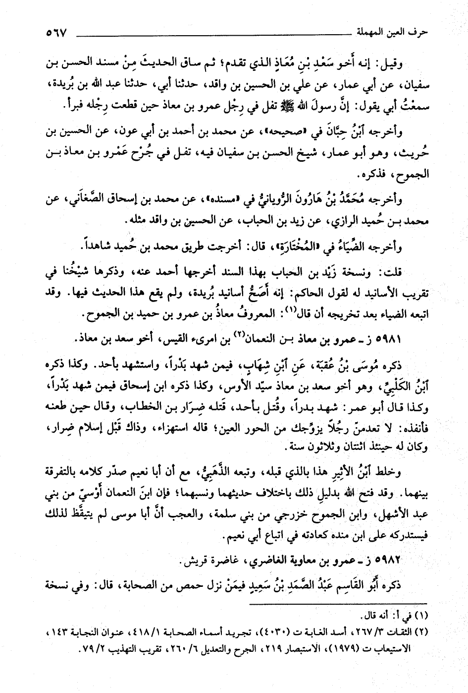 وأخرجه ابن حبّان في «صحيحه» ، عن محمد بن أحمد بن أبي عون، عن الحسين بن حريث، وهو أبو عمار، شيخ الحسن بن سفيان فيه، تفل في جرح عمرو بن معاذ بن الجموح، فذكره.