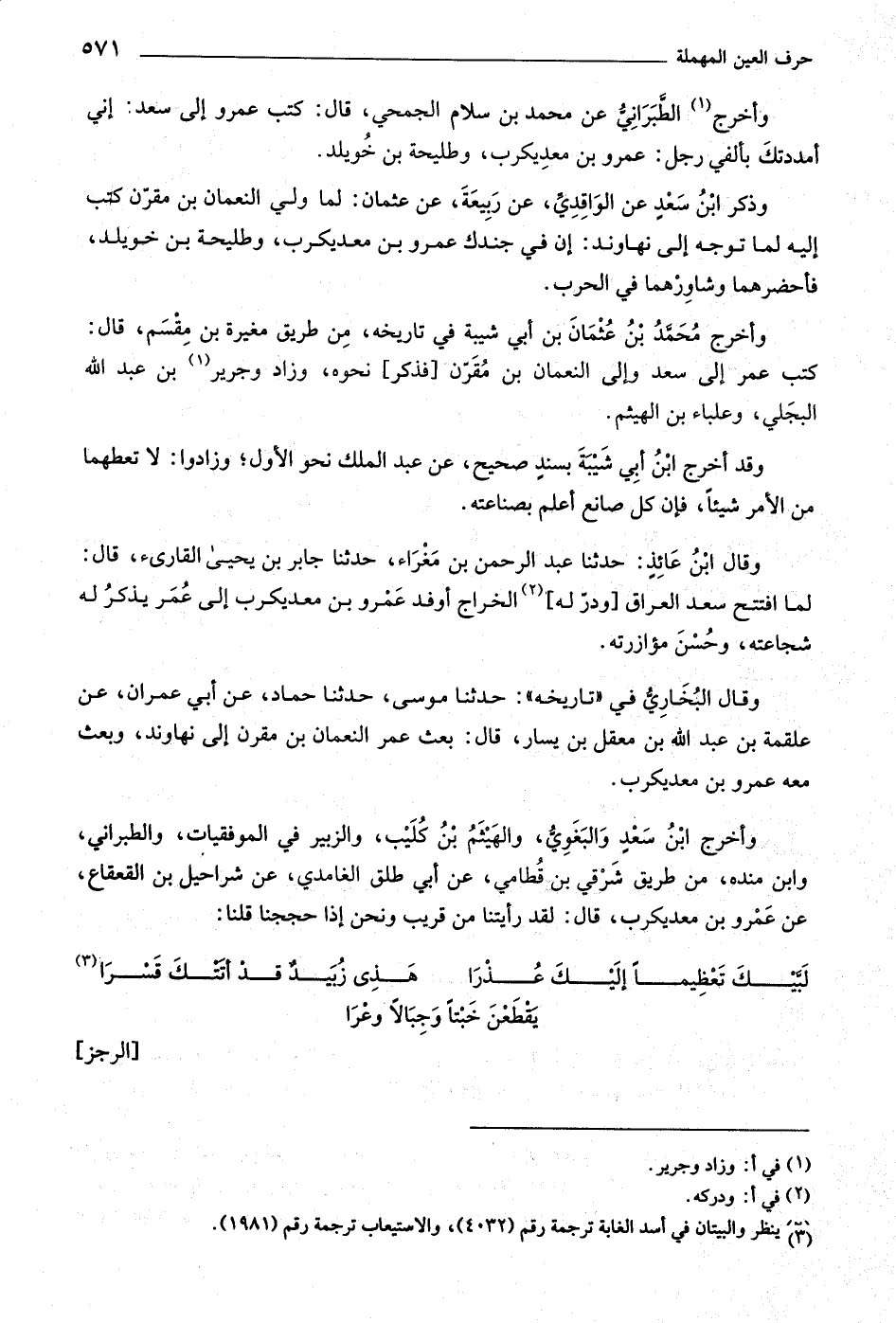 وقال البخاريّ في «تاريخه» : حدثنا موسى، حدثنا حماد، عن أبي عمران، عن علقمة بن عبد اللَّه بن معقل بن يسار، قال: بعث عمر النعمان بن مقرن إلى نهاوند، وبعث معه عمرو بن معديكرب.