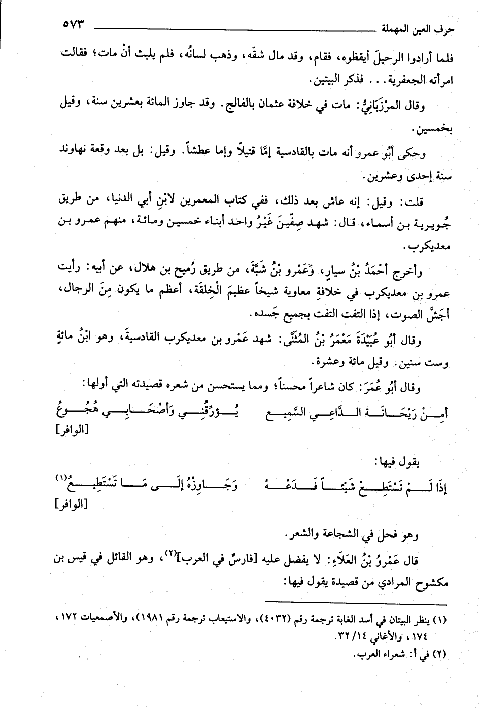 قلت: وقيل: إنه عاش بعد ذلك، ففي كتاب المعمرين لابن أبي الدنيا، من طريق جويرية بن أسماء، قال: شهد صفّين غير واحد أبناء خمسين ومائة، منهم عمرو بن معديكرب.