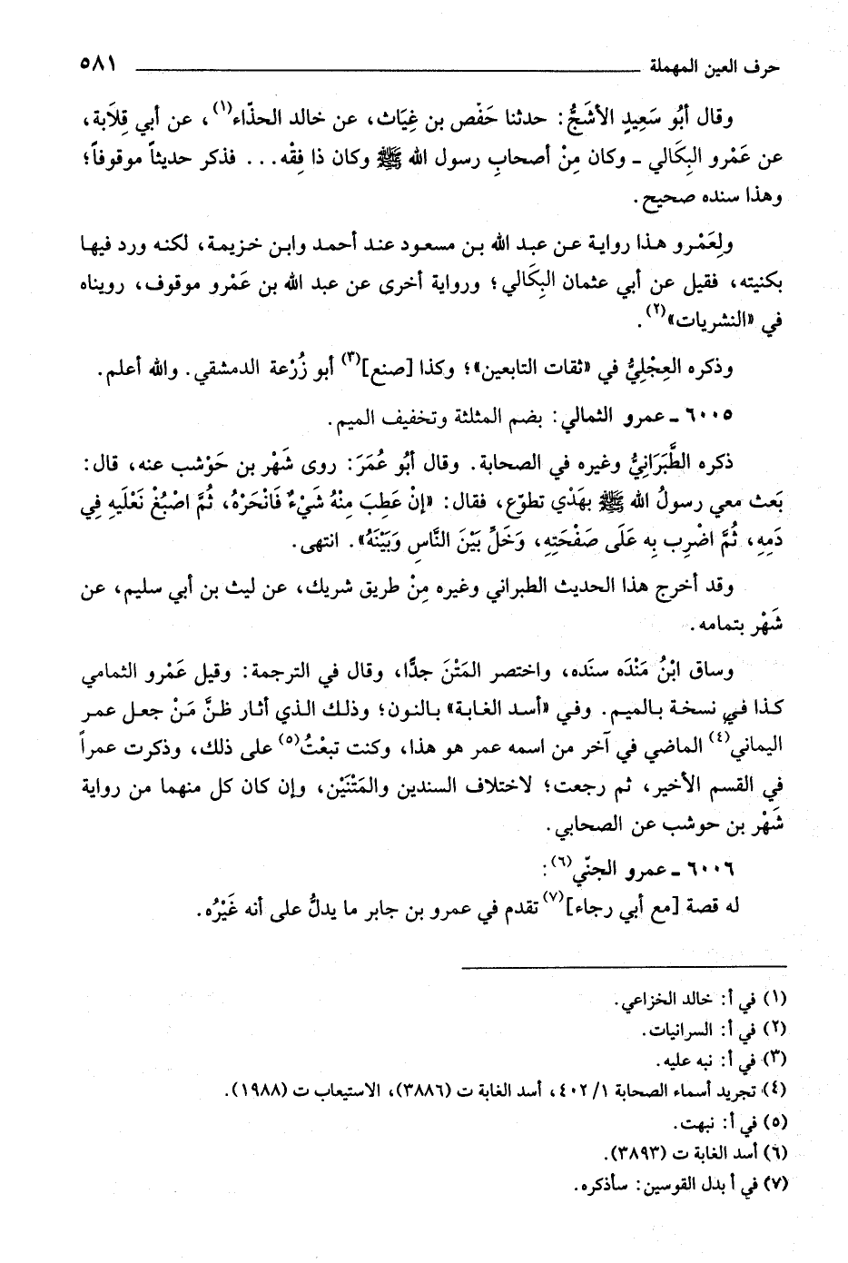 ولعمرو هذا رواية عن عبد اللَّه بن مسعود عند أحمد وابن خزيمة، لكنه ورد فيها بكنيته، فقيل عن أبي عثمان البكالي، ورواية أخرى عن عبد اللَّه بن عمرو موقوف، رويناه في «النشريات» «٢» .