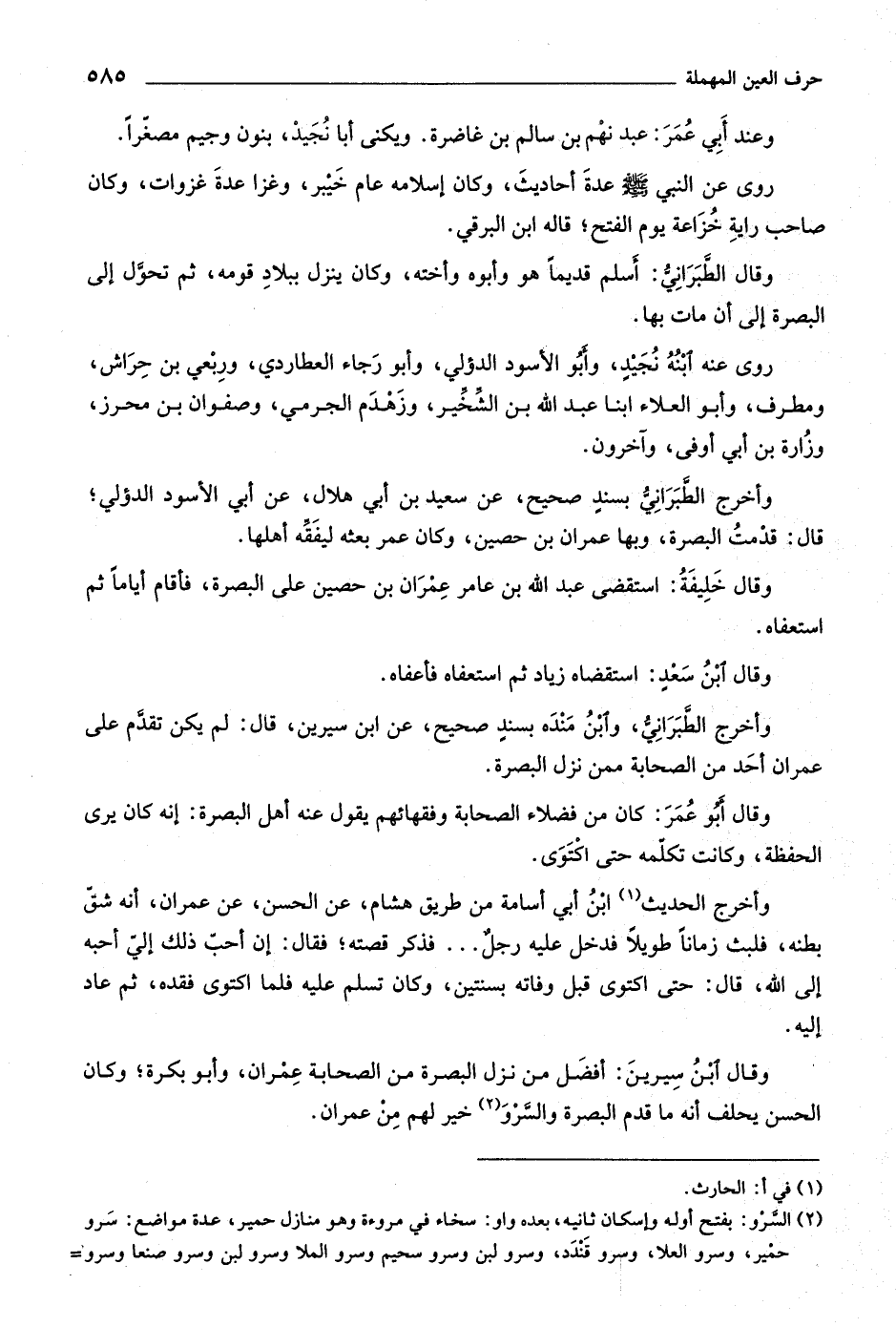 وأخرج الطّبرانيّ، وابن مندة بسند صحيح، عن ابن سيرين، قال: لم يكن تقدّم على عمران أحد من الصحابة ممن نزل البصرة.