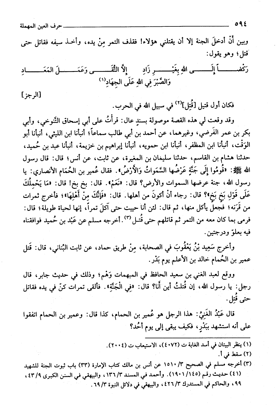 وقد وقعت لي هذه القصة موصولة بسند عال: قرأت على أبي إسحاق التّنوخي، وأبي بكر بن عمر الفرضيّ، وغيرهما، عن أحمد بن أبي طالب سماعا، أنبأنا ابن الليثي، أنبأنا أبو الوقت، أنبأنا ابن المظفر، أنبأنا ابن حمويه، أنبأنا إبراهيم بن خزيمة، أنبأنا عبد بن حميد، حدثنا هشام بن القاسم، حدثنا سليمان بن المغيرة، عن ثابت، عن أنس، قال: قال رسول اللَّه صلى اللَّه عليه وسلّم: «قوموا إلى جنّة عرضها السّماوات والأرض» . فقال عمير بن الحمام الأنصاري: يا رسول اللَّه، جنة عرضها السموات والأرض؟ قال: «نعم» . قال: بخ بخ! قال: «ما يحملك على قول بخ بخ» ؟ قال: رجاء أن أكون من أهلها. قال: «فإنّك من أهلها» ،