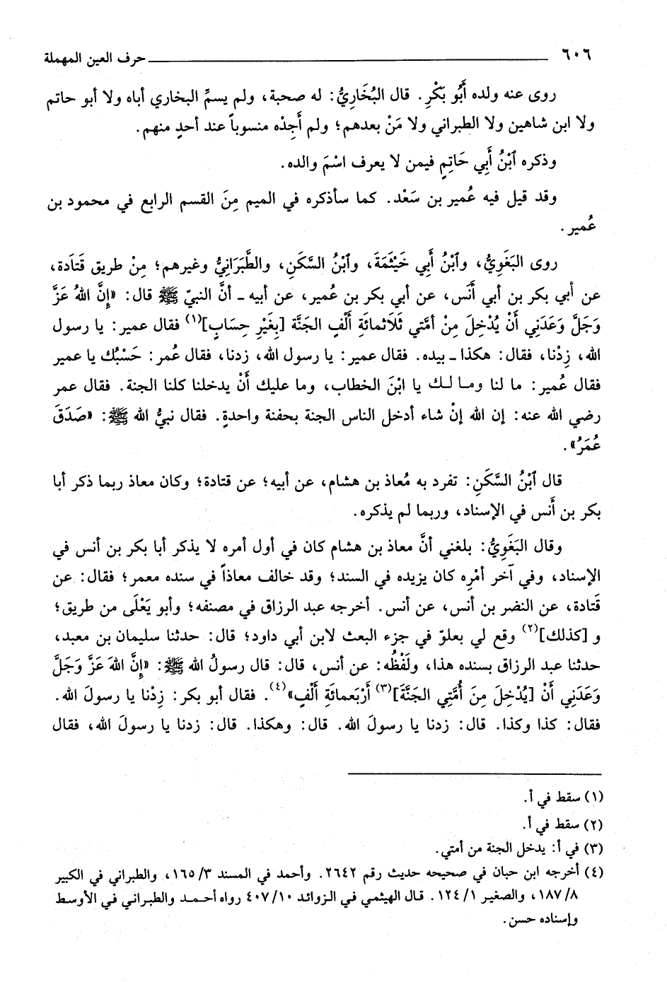 روى البغويّ، وابن أبي خيثمة، وابن السّكن، والطّبرانيّ وغيرهم، من طريق قتادة، عن أبي بكر بن أبي أنس، عن أبي بكر بن عمير، عن أبيه- أنّ النبيّ صلى اللَّه عليه وسلّم قال: «إنّ اللَّه عزّ وجلّ وعدني أن يدخل من أمّتي ثلاثمائة ألف الجنّة [بغير حساب] «١» فقال عمير: يا رسول اللَّه، زدنا، فقال: هكذا- بيده. فقال عمير: يا رسول اللَّه، زدنا، فقال عمر: حسبك يا عمير فقال عمير: ما لنا وما لك يا ابن الخطاب، وما عليك أن يدخلنا كلنا الجنة. فقال عمر رضي اللَّه عنه: إن اللَّه إن شاء أدخل الناس الجنة بحفنة واحدة. فقال نبيّ اللَّه صلى اللَّه عليه وسلّم: «صدق عمر» .