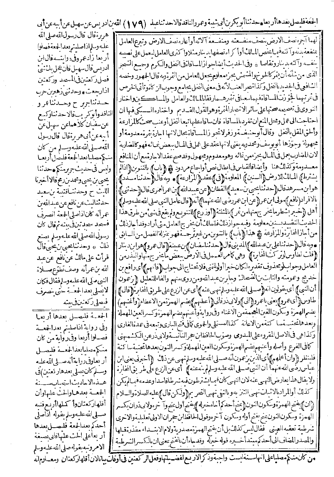 بالنخل وكذا شجر العنب لأنه في معنى النخل بجامع وجوب الزكاة وتأتي الخرص في ثمرتيهما فجوّزت المساقاة فيهما سعيًا في تثميرهما رفقًا بالمالك والعامل والمساكين، واختار النووي في تصحيحه صحتها على سائر الأشجار المثمرة وهو القول القديم، واختاره السبكي فيها إن احتاجت إلى عمل ومحل المنع أن تفرد بالمساقاة فإن ساقاه عليها تبعًا لنخل أو عنب صحّت كالمزارعة وألحق المقل بالنخل. وقال أبو حنيفة وزفر: لا تجوز المساقاة بحال لأنها إجارة بثمرة معدومة أو مجهولة، وجوّزها أبو يوسف ومحمد وبه يفتي لأنها عقد على عمل في المال ببعض نمائه فهو كالمضاربة لأن المضارب يعمل في المال بجزء من نمائه وهو معدوم ومجهول، وقد صح عقد الإجارة مع أن المنافع معدومة وكذلك هنا وأيضًا فالقياس في إبطال نص أو إجماع مردود.