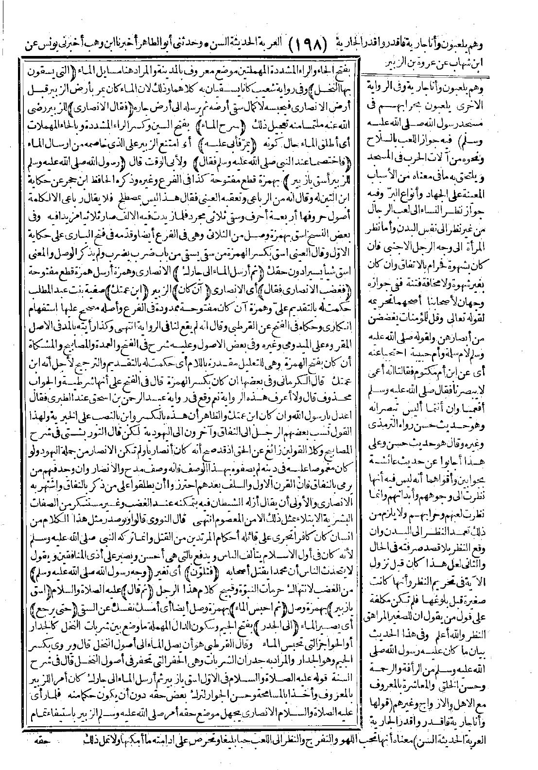 قال النوويّ قالوا ولو صدر مثل هذا الكلام من إنسان كان كافرًا تجري على قائله أحكام المرتدين من القتل، وإنما تركه النبي -صَلَّى اللَّهُ عَلَيْهِ وَسَلَّمَ- لأنه كان في أول الإسلام يتألف الناس ويدفع بالتي هي أحسن ويصبر على أذى المنافقين ويقول لا يتحدث الناس أن محمدًا يقتل أصحابه (فتلوّن) أي تغير (وجه رسول الله -صَلَّى اللَّهُ عَلَيْهِ وَسَلَّمَ-) من الغضب لانتهاك حرمات النبوّة وقبيح كلام هذا الرجل (ثم قال) عليه الصلاة والسلام (اسق يا زبير) بهمزة وصل (ثم احبس الماء) بهمزة وصل أيضًا أي أمسك نفسك عن السقي (حتى يرجع) أي يصير الماء (إلى الجدر) بفتح الجيم وسكون الدال المهملة ما وضع بين شربات النخل كالجدار أو الحواجز التي تحبس الماء. وقال القرطبي: هو أن يصل الماء إلى أصول النخل قال: ويروى بكسر الجيم وهو الجدار والمراد به جدران الشربات وهي الحفر التي تحفر في أصول النخل قال في شرح السُّنَّة قوله عليه الصلاة والسلام في الأول "اسق يا زبير ثم أرسل الماء إلى جارك" كان أمرًا للزبير بالمعروف وأخذًا بالمسامحة وحُسْن الجوار لترك بعض حقه دون أن يكون حكمًا منه، فلما رأى عليه الصلاة والسلام الأنصاري يجهل موضع حقه أمر -صَلَّى اللَّهُ عَلَيْهِ وَسَلَّمَ- الزبير باستيفاء تمام