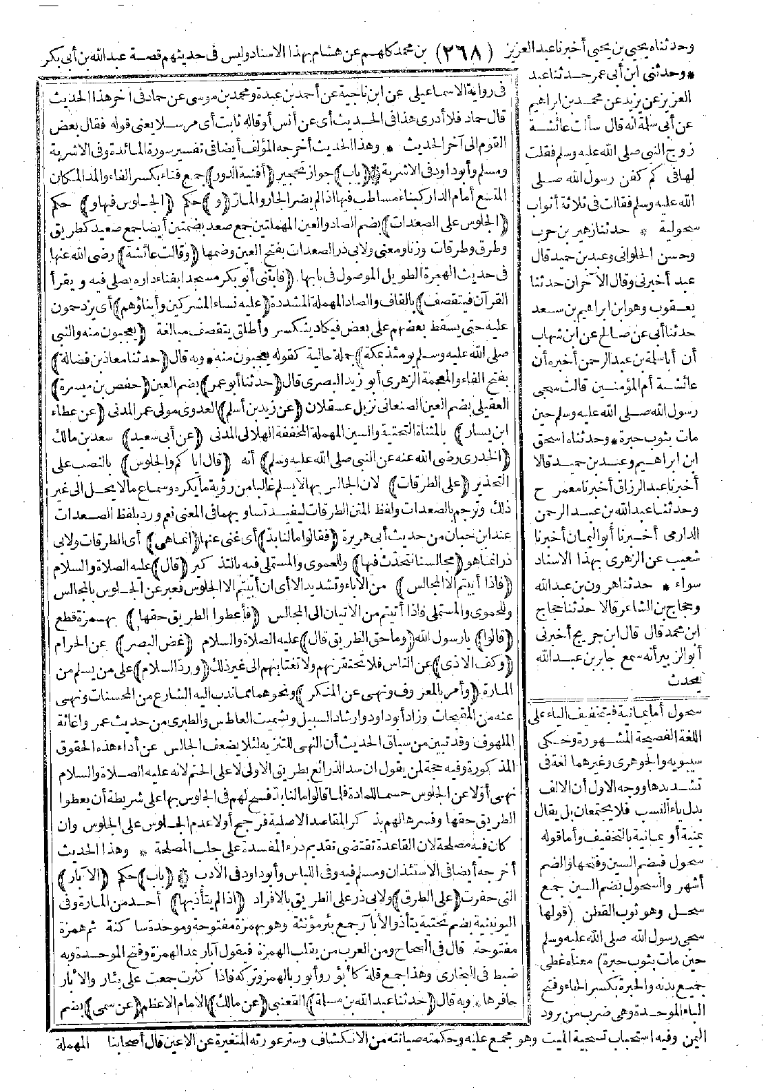 2465 - حَدَّثَنَا مُعَاذُ بْنُ فَضَالَةَ حَدَّثَنَا أَبُو عُمَرَ حَفْصُ بْنُ مَيْسَرَةَ عَنْ زَيْدِ بْنِ أَسْلَمَ عَنْ عَطَاءِ بْنِ يَسَارٍ عَنْ أَبِي سَعِيدٍ الْخُدْرِيِّ -رضي الله عنه- عَنِ النَّبِيِّ -صَلَّى اللَّهُ عَلَيْهِ وَسَلَّمَ- قَالَ: «إِيَّاكُمْ وَالْجُلُوسَ عَلَى الطُّرُقَاتِ. فَقَالُوا: مَا لَنَا بُدٌّ، إِنَّمَا هِيَ مَجَالِسُنَا نَتَحَدَّثُ فِيهَا. قَالَ: فَإِذَا أَبَيْتُمْ إِلاَّ الْمَجَالِسَ فَأَعْطُوا الطَّرِيقَ حَقَّهَا. قَالُوا: وَمَا حَقُّ الطَّرِيقِ؟ قَالَ: غَضُّ الْبَصَرِ، وَكَفُّ الأَذَى، وَرَدُّ السَّلاَمِ، وَأَمْرٌ بِالْمَعْرُوفِ، وَنَهْيٌ عَنِ الْمُنْكَرِ». [الحديث 2465 - طرفه في: 6229].