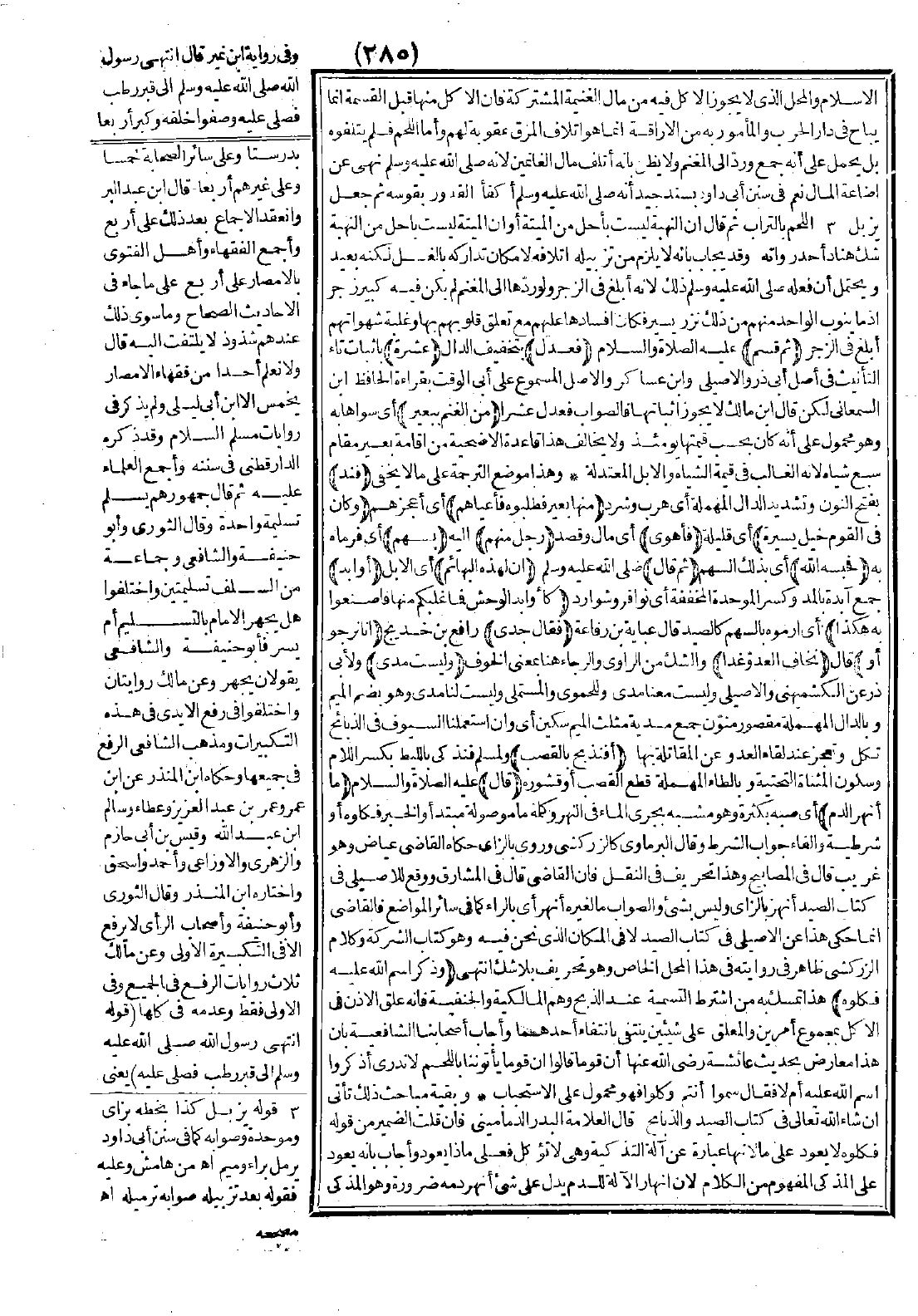 الإسلام والمحل الذي لا يجوز الأكل فيه من مال الغنيمة المشتركة، فإن الأكل منها قبل القسمة إنما يباح في دار الحرب، والمأمور به من الإراقة إنما هو إتلاف المرق عقوبة لهم، وأما اللحم فلم يتلفوه بل يحمل على أنه جمع وردّ إلى المغنم ولا يظن بأنه أتلف مال الغانمين لأنه -صَلَّى اللَّهُ عَلَيْهِ وَسَلَّمَ- نهى عن إضاعة المال. نعم في سنن أبي داود بسند جيد أنه -صَلَّى اللَّهُ عَلَيْهِ وَسَلَّمَ- أكفأ القدور بقوسه ثم جعل يزيل اللحم بالتراب ثم قال: "إن النهبة ليست بأحلّ من الميتة أو إن الميتة ليست بأحل من النهبة" شك هناد أحد رواته وقد يجاب بأنه لا يلزم من تزبيله إتلافه لإمكان تداركه بالغسل لكنه بعيد، ويحتمل أن فعله ذلك لأنه أبلغ في الزجر ولو ردّها إلى المغنم لم يكن فيه كبير زجر إذا ما ينوب الواحد منهم في ذلك نزر يسير فكان إفسادها عليهم مع تعلق قلوبهم بها وغلبة شهواتهم أبلغ في الزجر.