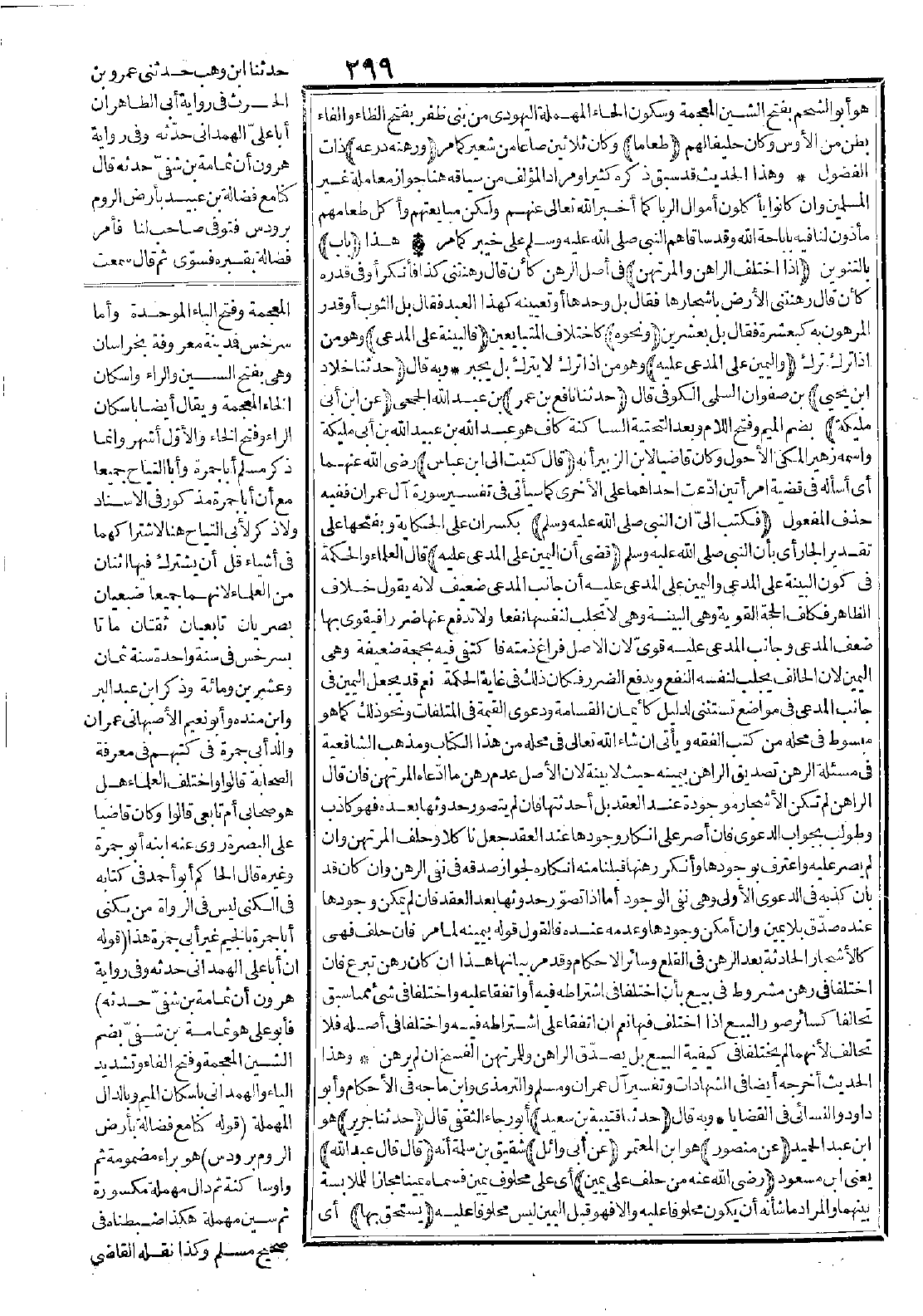 (إن النبى -صَلَّى اللَّهُ عَلَيْهِ وَسَلَّمَ-) بكسر إن على الحكاية وبفتحها على تقدير الجار أي بأن النبي -صَلَّى اللَّهُ عَلَيْهِ وَسَلَّمَ- (قضى أن اليمين على المدعى عليه) قال العلماء: والحكمة في كون البينة على المدعي واليمين على المدعى عليه أن جانب المدعي ضعيف لأنه يقول خلاف الظاهر فكلف الحجة القوية وهي البيّنة وهي لا تجلب لنفسها نفعًا ولا تدفع عنها ضررًا فيقوى بها ضعف المدعي وجانب المدّعى عليه قويّ لأن الأصل فراغ ذمته فاكتفي فيه بحجة ضعيفة وهي اليمين لأن الحالف يجلب لنفسه النفع ويدفع الضرر فكان ذلك في غاية الحكمة. نعم قد يجعل اليمين في جانب المدعي في مواضع تستثنى لدليل كأيمان القسامة ودعوى القيمة في المتلفات ونحو ذلك كما هو مبسوط في محله من كتب الفقه، ويأتي إن شاء الله تعالى في محله من هذا الكتاب ومذهب الشافعية في مسألة الرهن تصديق الراهن بيمينه حيث لا بينة لأن الأصل عدم رهن ما ادّعاه المرتهن فإن قال الراهن: لم تكن الأشجار موجودة عند العقد بل أحدثتها فإن لم يتصور حدوثها بعده فهو كاذب وطولب بجواب الدعوى فإن أصرّ على إنكار وجودها عند العقد جعل ناكلاً وحلف المرتهن وإن لم يصر عليه واعترف بوجودها وأنكر رهنها قبلنا منه إنكاره لجواز صدقه في نفي الرهن، وإن كان قد بان كذبه في الدعوى الأولى وهي نفي الوجود أما إذا تصور حدوثها بعد العقد فإن لم يمكن وجودها عنده صدّق بلا يمين وإن أمكن وجودها وعدمه عنده فالقول قوله بيمينه لما مر، فإن حلف فهي كالأشجار الحادثة بعد الرهن في القلع وسائر الأحكام، وقد مرّ بيانها هذا إن كان رهن تبرع فإن اختلفا في رهن مشروط في بيع بأن اختلفا في اشتراطه فيه أو اتفقا عليه واختلفا في شيء مما سبق تحالفًا كسائر صور البيع إذا اختلف فيها. نعم إن اتفقا على اشتراطه فيه واختلفا في أصله فلا تحالف لأنهما لم يختلفا في كيفية البيع بل يصدّق الراهن وللمرتهن الفسخ إن لم يرهن.