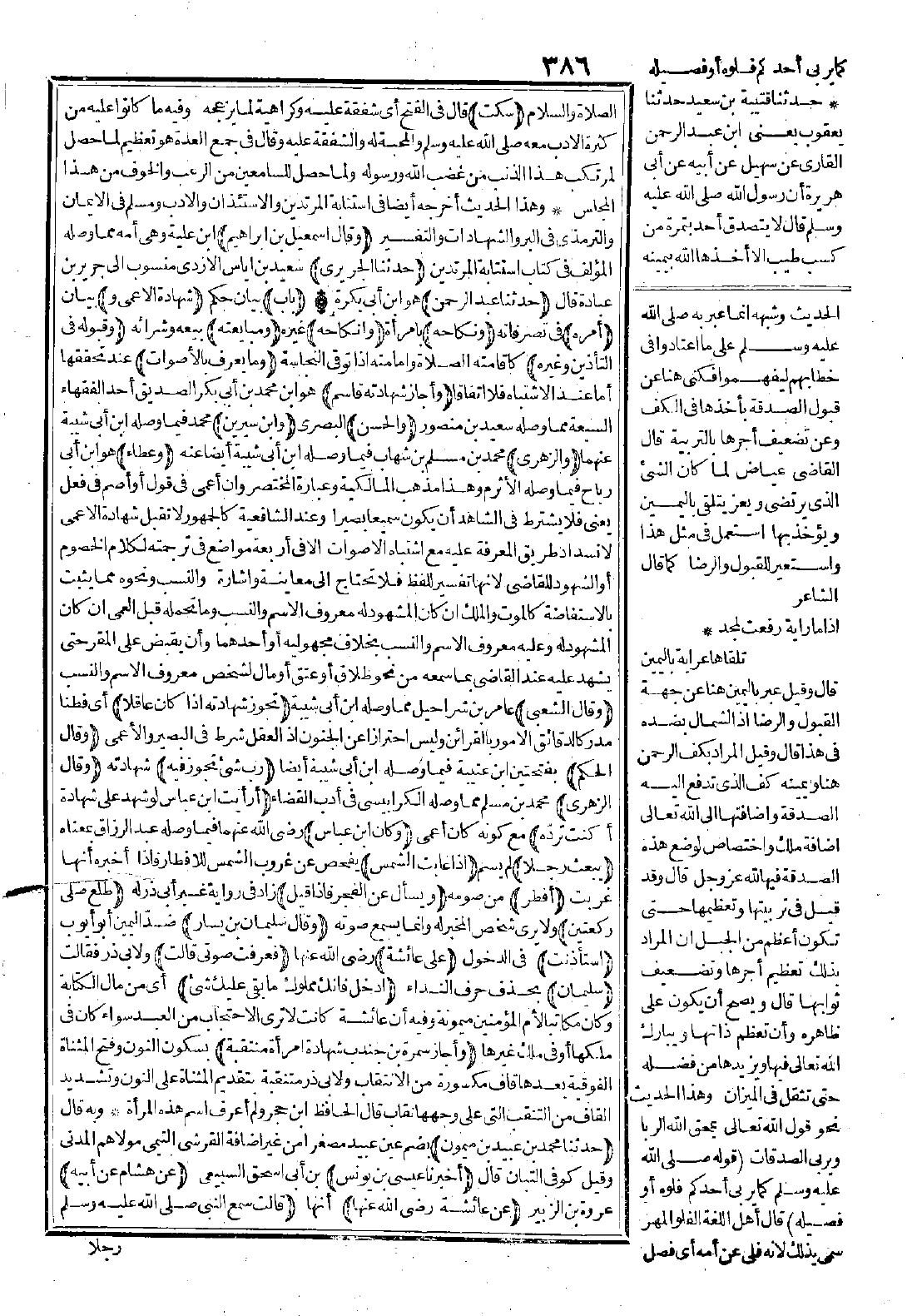 شَهَادَةِ الأَعْمَى وَأَمْرِهِ وَنِكَاحِهِ وَإِنْكَاحِهِ وَمُبَايَعَتِهِ وَقَبُولِهِ فِي التَّأْذِينِ وَغَيْرِهِ. وَمَا يُعْرَفُ بِالأَصْوَاتِ. وَأَجَازَ شَهَادَتَهُ قَاسِمٌ وَالْحَسَنُ وَابْنُ سِيرِينَ وَالزُّهْرِيُّ وَعَطَاءٌ. وَقَالَ الشَّعْبِيُّ: تَجُوزُ شَهَادَتُهُ إِذَا كَانَ عَاقِلاً. وَقَالَ الْحَكَمُ: رُبَّ شَىْءٍ تَجُوزُ فِيهِ. وَقَالَ الزُّهْرِيُّ: أَرَأَيْتَ ابْنَ عَبَّاسٍ لَوْ شَهِدَ عَلَى شَهَادَةٍ أَكُنْتَ تَرُدُّهُ؟ وَكَانَ ابْنُ عَبَّاسٍ يَبْعَثُ رَجُلاً، إِذَا غَابَتِ الشَّمْسُ أَفْطَرَ. وَيَسْأَلُ عَنِ الْفَجْرِ فَإِذَا قِيلَ لَهُ طَلَعَ صَلَّى رَكْعَتَيْنِ. وَقَالَ سُلَيْمَانُ بْنُ يَسَارٍ: اسْتَأْذَنْتُ عَلَى عَائِشَةَ فَعَرَفَتْ صَوْلتى، قَالَتْ: سُلَيْمَانُ؟ ادْخُلْ فَإِنَّكَ مَمْلُوكٌ مَا بَقِيَ عَلَيْكَ شَىْءٌ. وَأَجَازَ سَمُرَةُ بْنُ جُنْدَبٍ شَهَادَةَ امْرَأَةٍ مُنْتَقِبَةٍ.