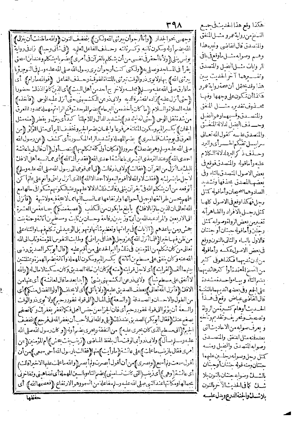 وحذف الفاعل للعلم به (في شأني وحيًا) زاد في رواية يونس يتلى (ولأنا أحقر في نفسي من أن يتكلم بالقرآن في أمري) بضم ياء يتكلم. وعند ابن إسحاق يقرأ في المساجد ويصلّى به، (ولكني كنت أرجو أن يرى رسول الله -صَلَّى اللَّهُ عَلَيْهِ وَسَلَّمَ- في النوم رؤيا يبرئني الله) بها، ولأبوي ذر والوقت: تبرئني بالمثناة الفوقية وحذف الفاعل (فوالله ما رام) أي ما فارق -صَلَّى اللَّهُ عَلَيْهِ وَسَلَّمَ- (مجلسه ولا خرج أحد من أهل البيت) أي الذين كانوا إذ ذاك حضورًا (حتى أنزل عليه) زاده الله شرفًا لديه، ولأبي ذر عن الكشميهني حتى أنزل عليه الوحي (فأخده) عليه الصلاة والسلام (ما كان يأخذ من البرحاء) بضم الموحدة وفتح الراء ثم مهملة ممدودًا العرق من شدة ثقل الوحي (حتى أنه ليتحدر) بتشديد الدال واللام للتأكيد أي ينزل ويقطر (منه مثل الجمان) بكسر الميم وسكون المثلثة مرفوعًا والجمان بضم الجيم وتخفيف الميم أي مثل اللؤلؤ (من العرق في يوم شاتٍ، فلما سري) بضم المهملة وتشديد الراء المكسورة أي كشف (عن رسول الله -صَلَّى اللَّهُ عَلَيْهِ وَسَلَّمَ- وهو يضحك) سرورًا (فكان أول كلمة تكلم بها) بنصب أول (أن قال لي): (يا عائشة احمدي الله) وعند الترمذي البشرى يا عائشة احمدي الله (فقد برأك الله) أي مما نسبه أهل الإفك إليك بما أنزل من القرآن: (فقالت) ولأبي ذر: قالت (لي أمي قومي إلى رسول الله -صَلَّى اللَّهُ عَلَيْهِ وَسَلَّمَ-) لأجل ما بشّرك به (فقلت: لا والله لا أقوم إليه ولا أحمد إلا الله) الذي أنزل براءتي وأنعم عليّ بما لم أكن أتوقعه من أن يتكلم الله فيّ بقرآن يُتلى وقالت ذلك إدلالاً عليهم وعتبًا لكونهم شكّوا في حالها مع علمهم بحسن طرائقها وجميل أحوالها وارتفاعها عما نسب إليها مما لا حجة فيه ولا شبهة، (فأنزل الله تعالى {إن الذين جاءوا بالأفك}) بأبلغ ما يكون من الكذب ({عصبة منكم}) [النور: 11] جماعة من العشرة إلى الأربعين، والمراد عبد الله بن أبي وزيد بن رفاعة، وحسان بن ثابت، ومسطح بن أثاثة، وحمنة بنت جحش ومن ساعدهم (الأيات) في براءتها وتعظيم شأنها وتهويل الوعيد لمن تكلم فيها والثناء على من ظن فيها خيرًا.