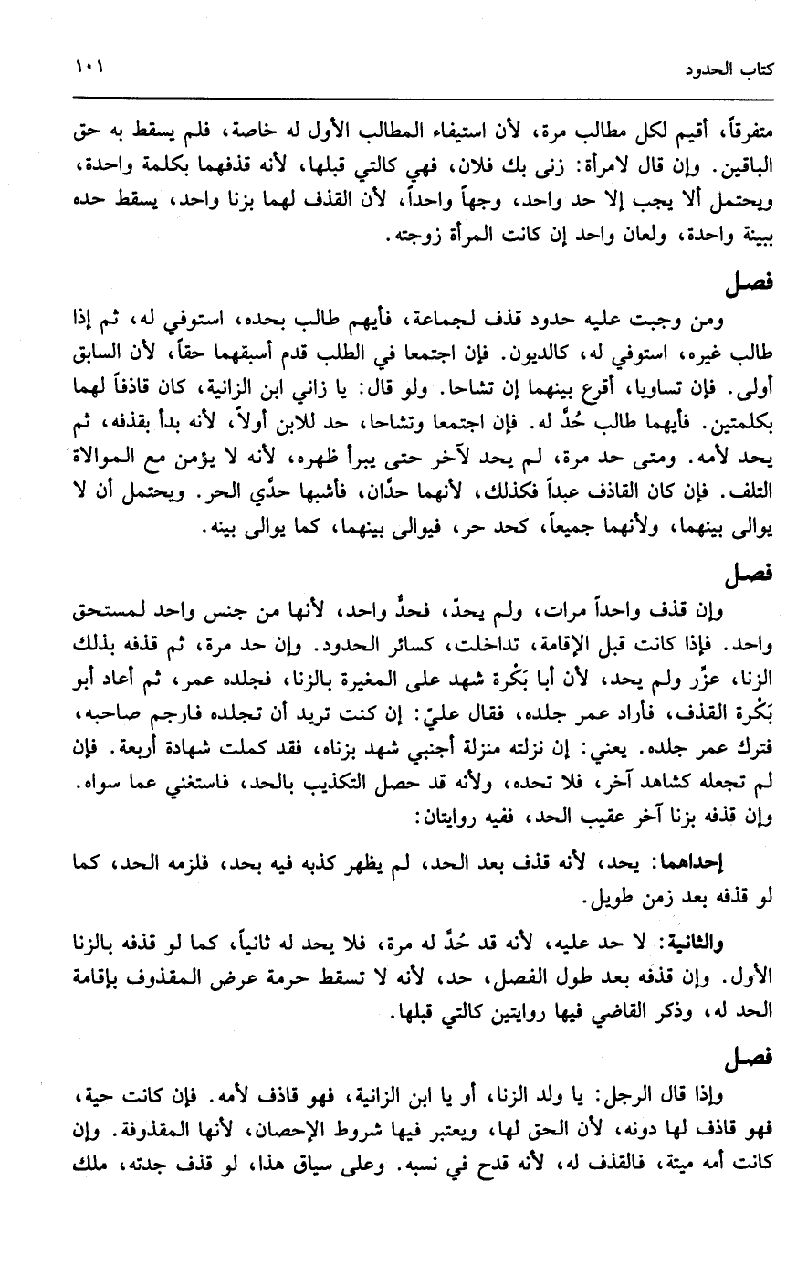 متفرقاً، أقيم لكل مطالب مرة؛ لأن استيفاء المطالب الأول له خاصة، فلم يسقط به حق الباقين. وإن قال لامرأة: زنى بك فلان، فهي كالتي قبلها؛ لأنه قذفهما بكلمة واحدة ويحتمل ألا يجب إلا حد واحد، وجهاً واحداً؛ لأن القذف لهما بزنا واحد، يسقط حده ببينة واحدة، ولعان واحد إن كانت المرأة زوجته.