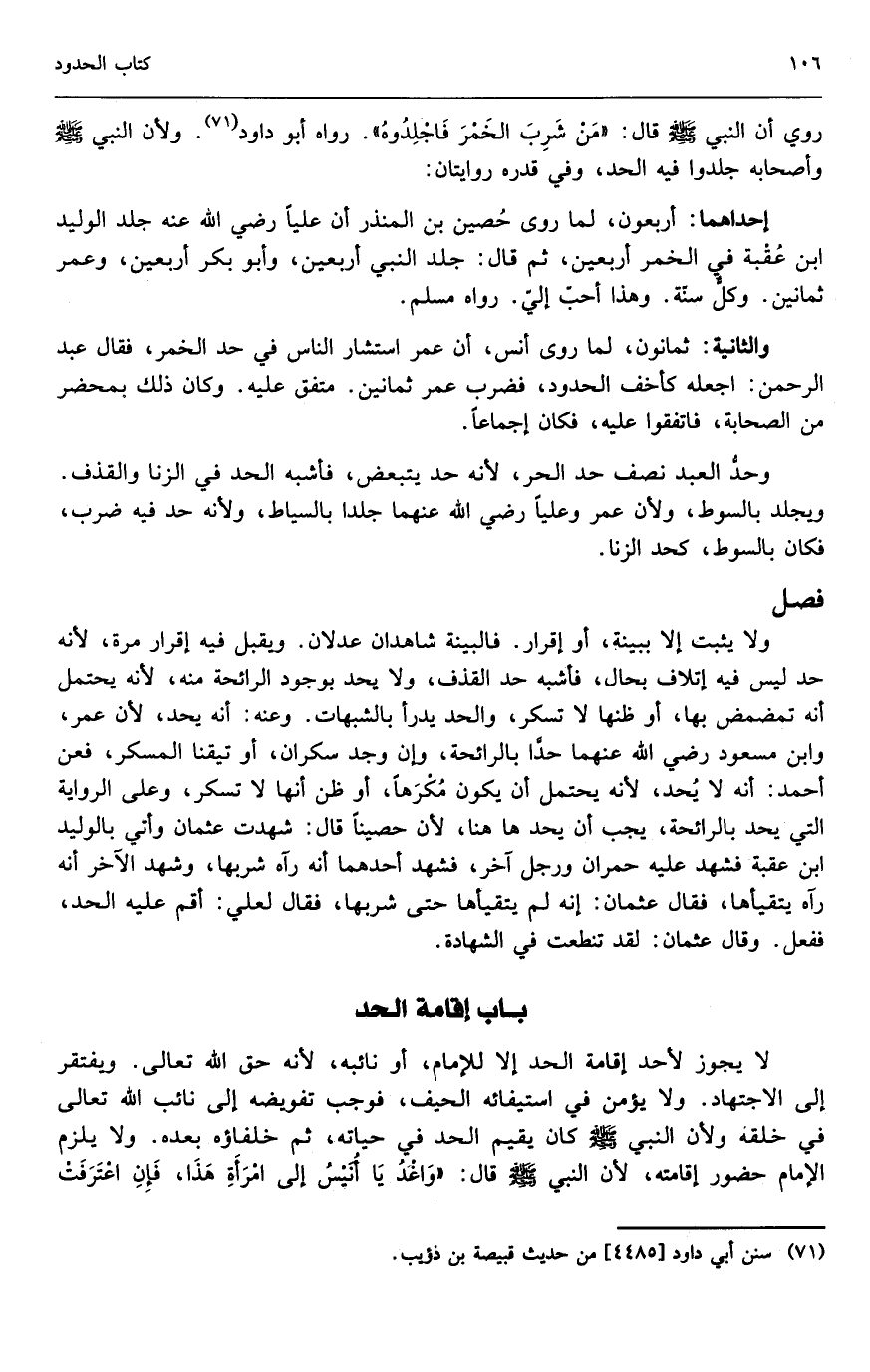 لا يجوز لأحد إقامة الحد إلا للإمام، أو نائبه؛ لأنه حق الله تعالى. ويفتقر إلى الاجتهاد. ولا يؤمن في استيفائه الحيف، فوجب تفويضه إلى نائب الله تعالى في خلقه، ولأن النبي - صَلَّى اللَّهُ عَلَيْهِ وَسَلَّمَ - كان يقيم الحد في حياته، ثم خلفاؤه بعده. ولا يلزم الإمام حضور إقامته؛ لأن النبي - صَلَّى اللَّهُ عَلَيْهِ وَسَلَّمَ - قال: «واغد يا أنيس إلى امرأة هذا، فإن اعترفت